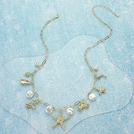 Anchor Sea Shell Pearl Dolphin Fish Rope Sea Turtle Charm Embellished Triple Layered Necklace