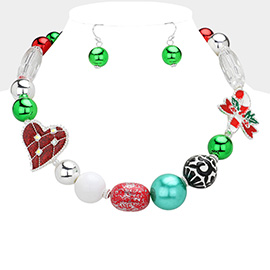 Stone Detailed Enamel Christmas Bow Candy Cane Charm Peal Engraved Beaded Necklace