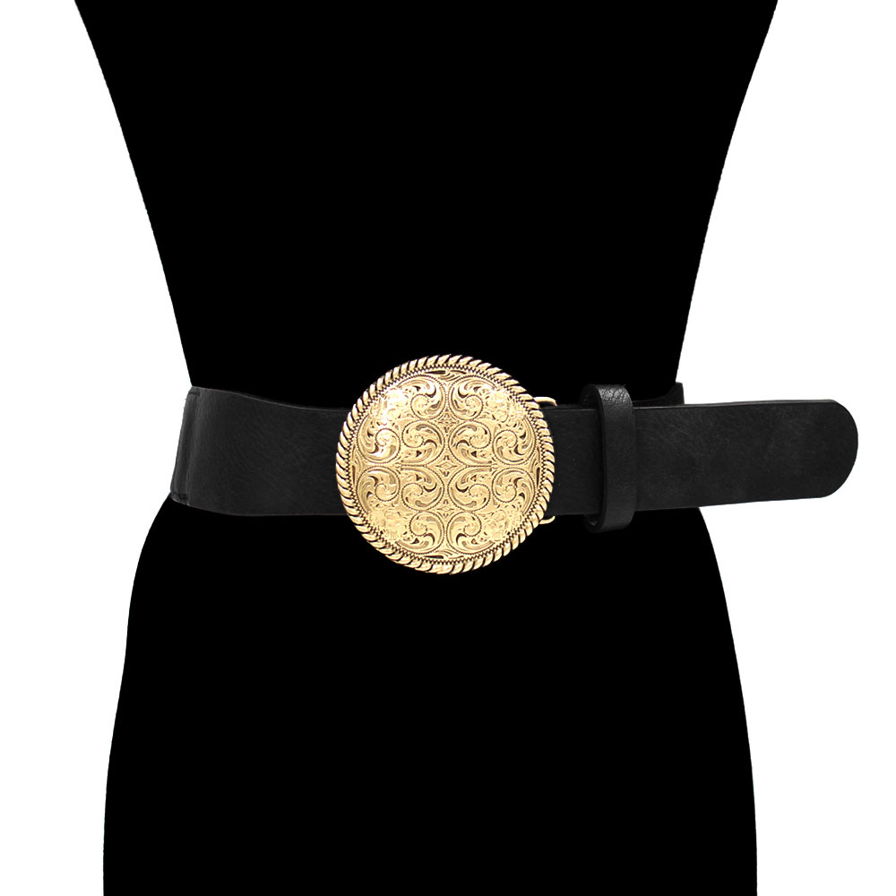 Details • Size : 2.75" H, 37.5" L • Stretchable • This round embossed buckle waist belt blends classic design with elegant detail. The ornate circular buckle adds refined charm, making it ideal for accentuating both casual and dressy outfits. A statement accessory that brings timeless sophistication to any look. • Lead and Nickel Compliant