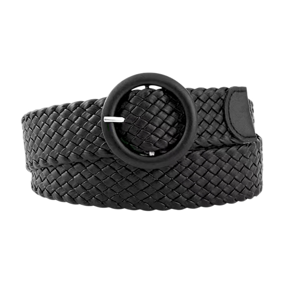 • Chic braided faux leather belt featuring a sleek round buckle. Perfect for adding texture and a polished finish to dresses, jeans, or skirts for both casual and refined looks.