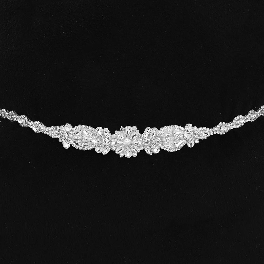 Details • Size : 16.75" X 1", 70" L • This crystal leaf and floral slim waist belt features an elegant, low-profile design with refined decorative detailing that enhances the waistline beautifully. Ideal for dresses, bridal gowns, and formal looks, it adds subtle sparkle and graceful definition. A versatile styling accessory for weddings, proms, evening wear, and special occasions, perfect for boutique and occasion-focused collections.