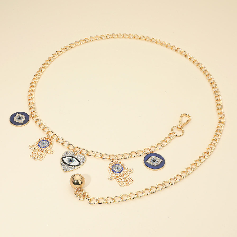 Details • Size : 2.25" H, 4.5" L • Infuse your style with meaning and glamour using this evil eye and Hamsa charm chain waist belt. Adorned with intricate charms and sparkling accents, it brings a unique blend of elegance and symbolism—perfect for elevating any dress or evening look. • Lead and Nickel Compliant