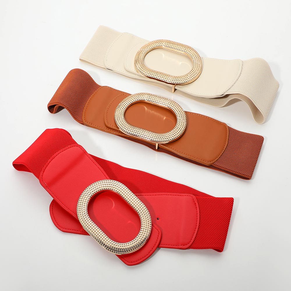 Textured Metal Oval Buckle Accent Wide Elastic Waist Belt