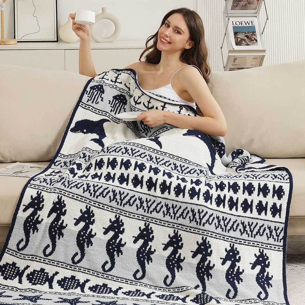 Dolphin Seahorse Fish Starfish Patterned Reversible Throw Blanket