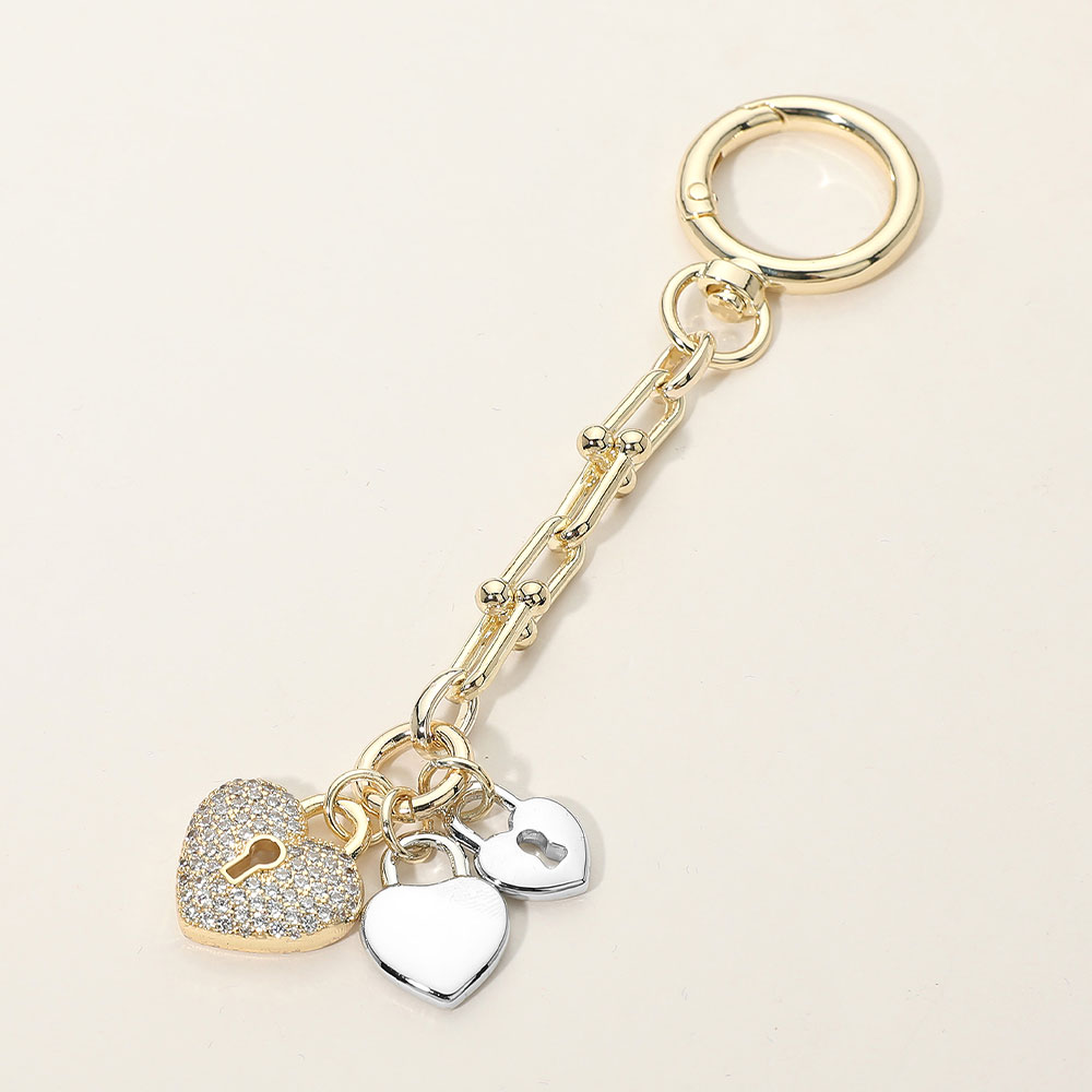 Details • Size : 5" L, 0.8" X 3.7" • This multi heart charm keychain features layered heart accents with lock-inspired details and crystal-style sparkle for a playful yet polished look. Designed to hang from a sleek linked chain, it’s ideal for boutiques seeking giftable accessories that add charm, shine, and everyday personality to keys or bags. • CZ Cubic Zirconia • Gold Dipped