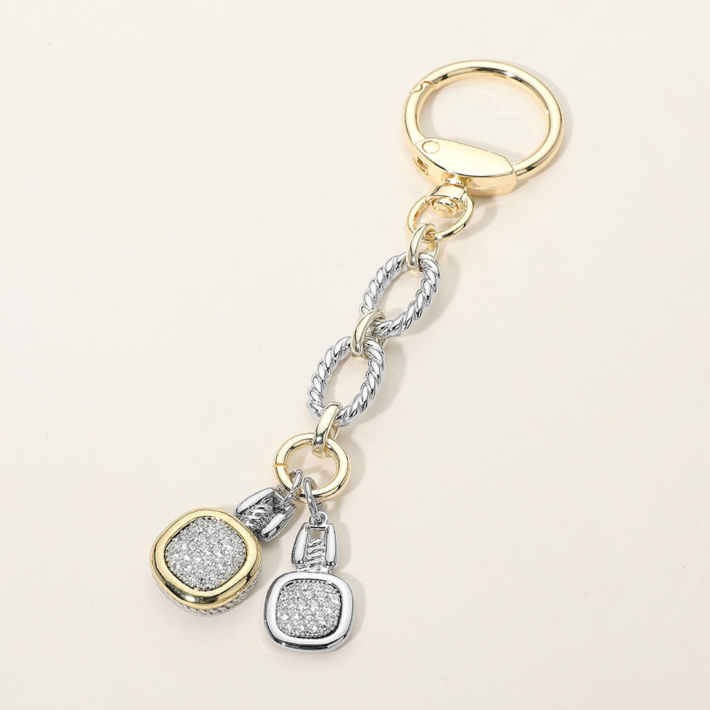 Details • Size : 5" L, 1" X 3.5" • This double charm keychain features two crystal-accented charms suspended from linked chain elements for a balanced, eye-catching look. Designed to add subtle shine and modern style to keys or bags, it’s ideal for boutiques seeking elegant, giftable accessories with everyday functionality and refined appeal. • CZ Cubic Zirconia • Gold Dipped