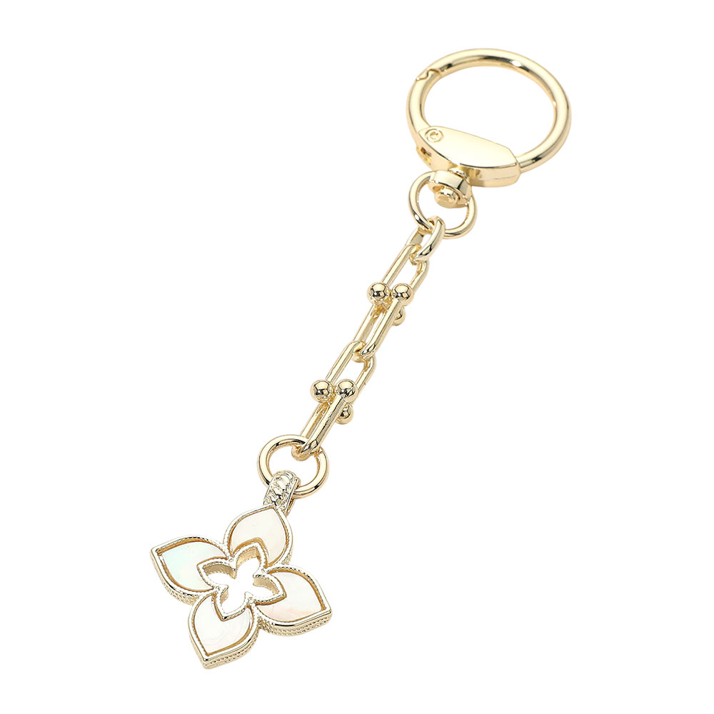 Details • Size : 5.5" L, 1.25" X 3.75" • This floral charm keychain features a layered flower-inspired accent suspended from a sleek linked chain for a refined, feminine statement. Designed for easy attachment to keys or bags, it’s ideal for boutiques seeking giftable accessories that add charm, elegance, and everyday versatility to modern styling. • Gold Dipped