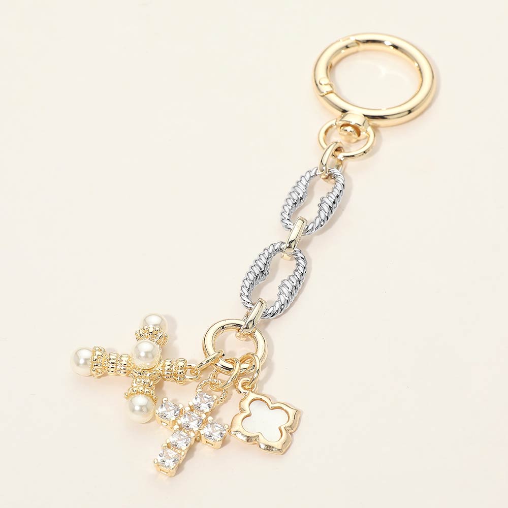 Details • Size : 5" L, 1" X 3.6" • This elegant charm chain keychain features a sparkling cross, a delicate clover accent, and refined bead details arranged on a stylish linked chain. Designed to elevate keys, handbags, or accessories, it adds a meaningful yet decorative touch to everyday essentials. A versatile accessory ideal for gifting, boutique collections, or seasonal assortments, combining timeless symbolism with polished charm appeal. • CZ Cubic Zirconia • Gold Dipped