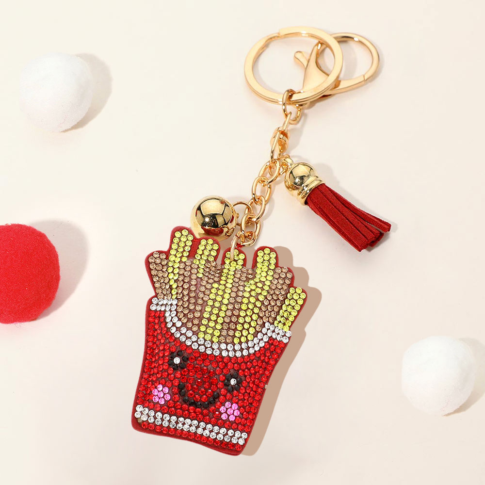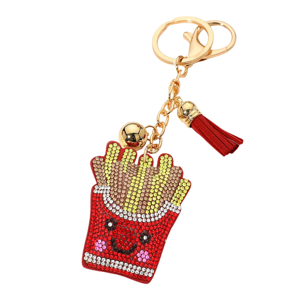 Details • Size : 2.2" X 2.7", 6.5" L • Fun and playful French fries rhinestone keychain featuring sparkling stones, a tassel, and a bell accent. A stylish charm for bags, purses, or keys that adds personality and a touch of whimsy to everyday accessories. Perfect as a gift or personal statement piece. • Lead and Nickel Compliant