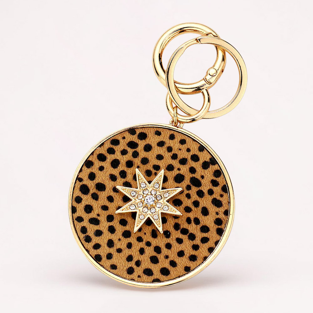 Cheetah Patterned Genuine Leather Calf Round Keychain Bag Charm