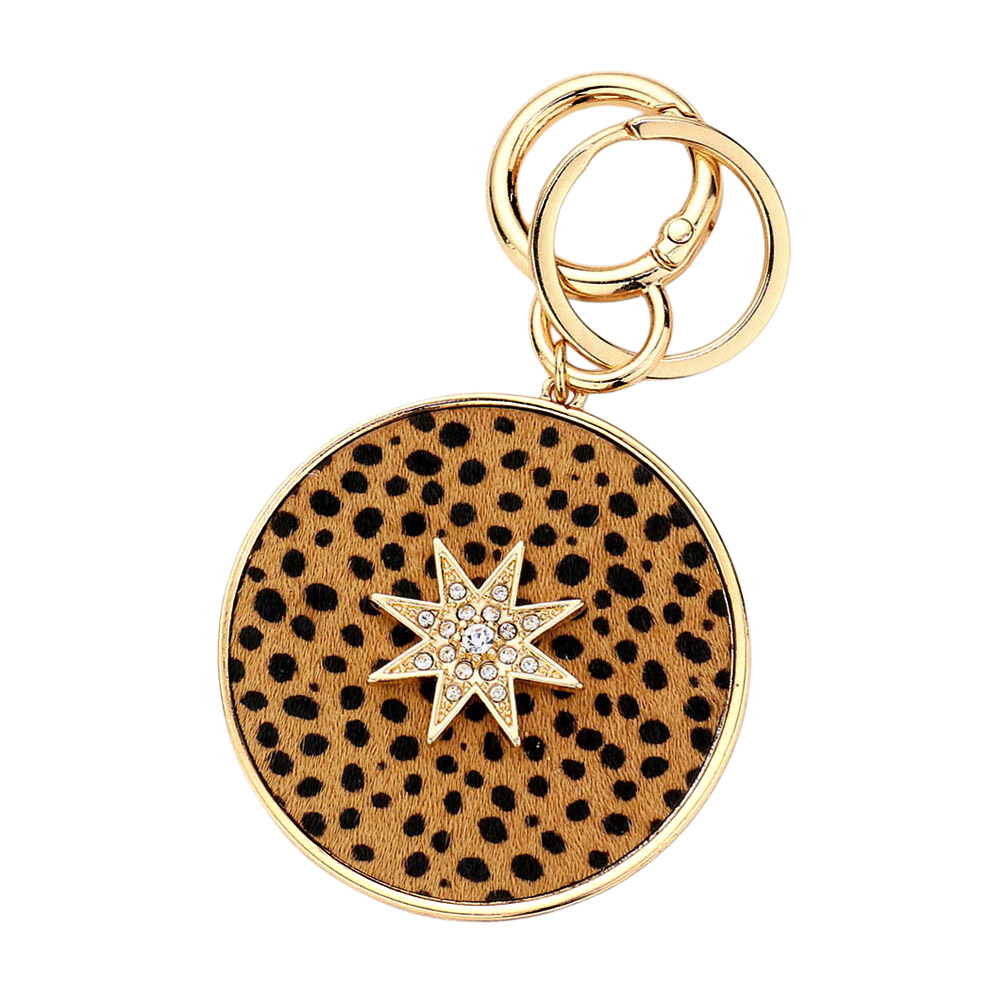 • This round keychain with star embellishment is a chic and practical accessory for keys, handbags, or backpacks. Designed with a bold patterned finish and sparkling detail, it adds personality and style while keeping your essentials secure and easy to carry.