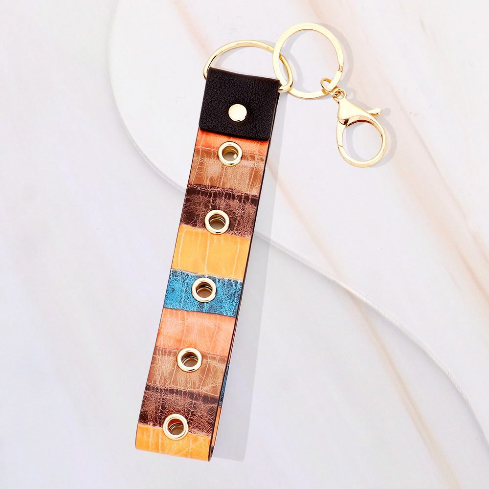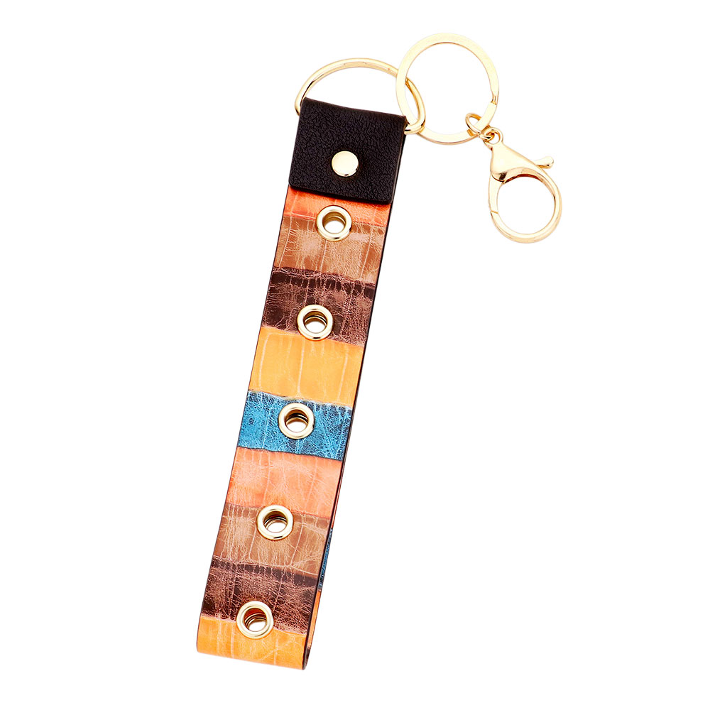 • Brighten your everyday essentials with this multicolor striped leather keychain featuring bold tones, gold grommet accents, and a secure keyring with clasp. Stylish and practical, it keeps keys organized while adding a trendy touch, making it a perfect gift or personal accessory.