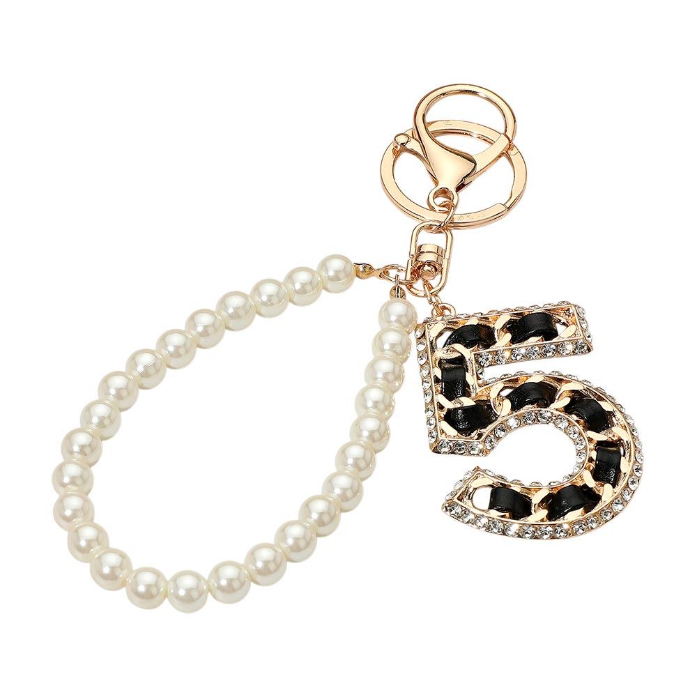 Details • Size : 6.5" L, 1.5" X 2.2" • Stylish keychain featuring a number 5 charm with crystal accents, a pearl loop handle, and a chain-wrapped design. A chic and functional accessory perfect for adding flair to bags, purses, or keys with a touch of elegant detail. • Lead and Nickel Compliant