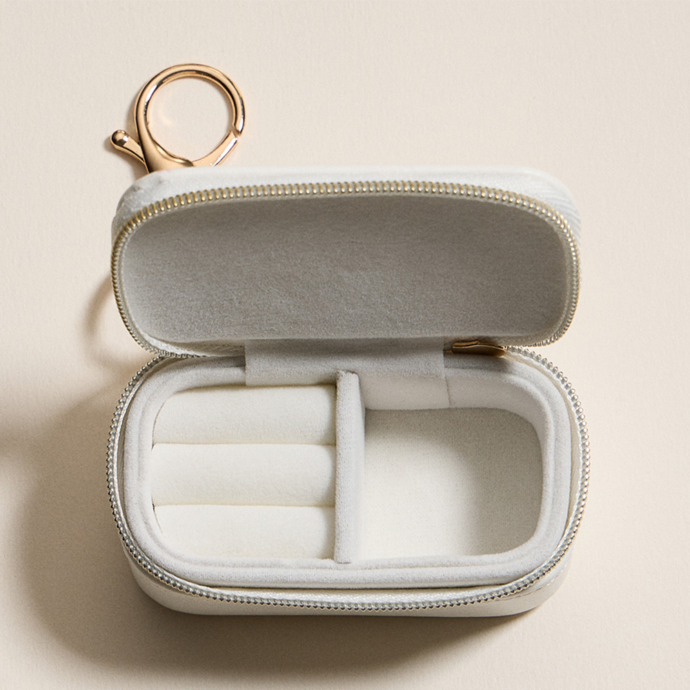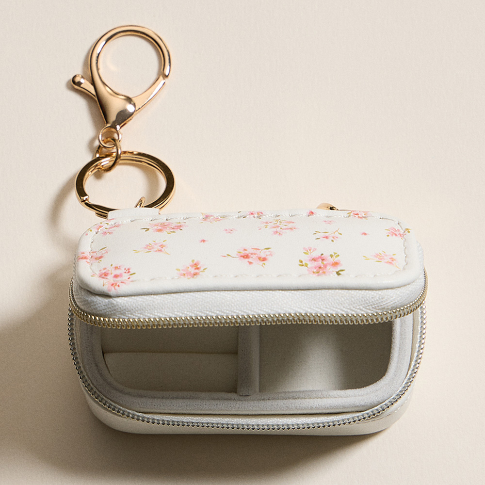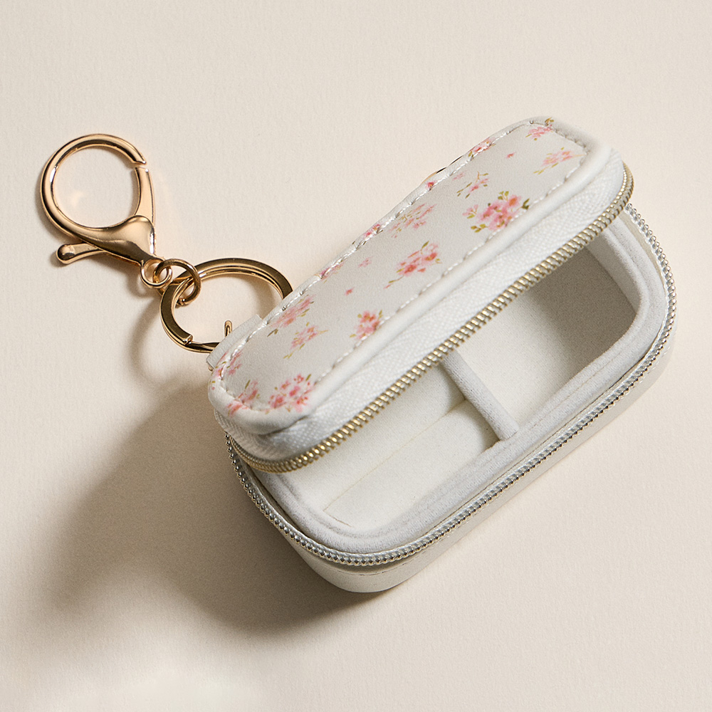 Details • Size : 3" X 1.5" X 1.5" • Zipper closure for secure storage • Polished gold-tone keyring with clasp hardware • Compact storage for rings, earrings & small jewelry • Ideal for travel, everyday use, or thoughtful gifts • Keep your jewelry safe and stylish on the go with this rectangular portable jewelry storage case keychain. Featuring a floral print design, secure zipper closure, and compartments for rings and earrings, it’s perfect for travel or daily use, combining charm and practicality in one compact accessory.