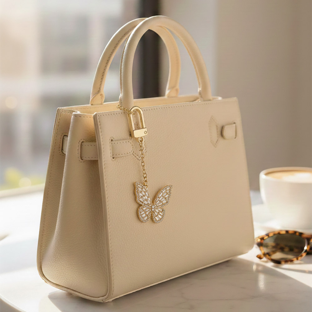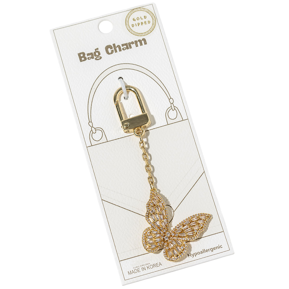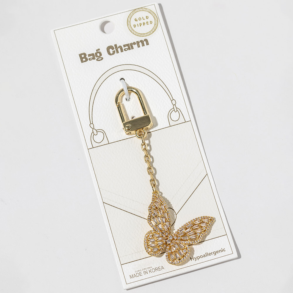 Details • Size : 3.5" L, 1.4" X 2.5" • Elegant butterfly bag charm designed with shimmering crystal accents for a graceful, eye-catching statement. Clips easily onto handbags, totes, backpacks, or keys to add movement and shine. A stylish accessory perfect for gifting, seasonal collections, and boutique displays seeking feminine charm. • Lead and Nickel Compliant • Hypoallergenic • Made In Korea • Gold Dipped • CZ Cubic Zirconia