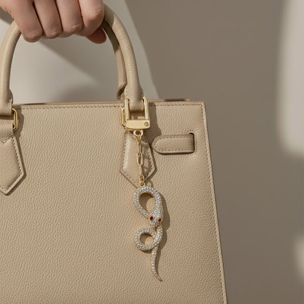 • Statement snake bag charm designed with sparkling crystal accents for a bold, fashion-forward look. Easily clips onto handbags, totes, backpacks, or keys to add edge and shine. A striking accessory ideal for gifting, trend-driven displays, and boutique collections seeking standout style.