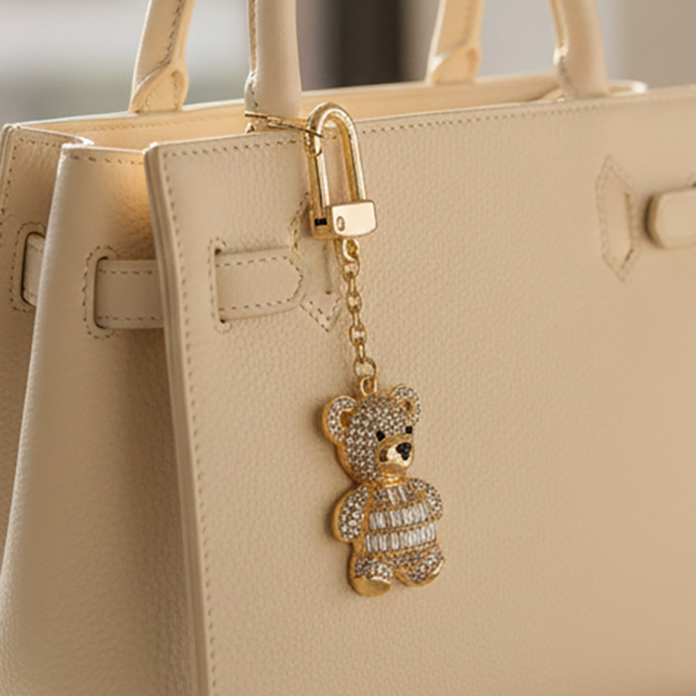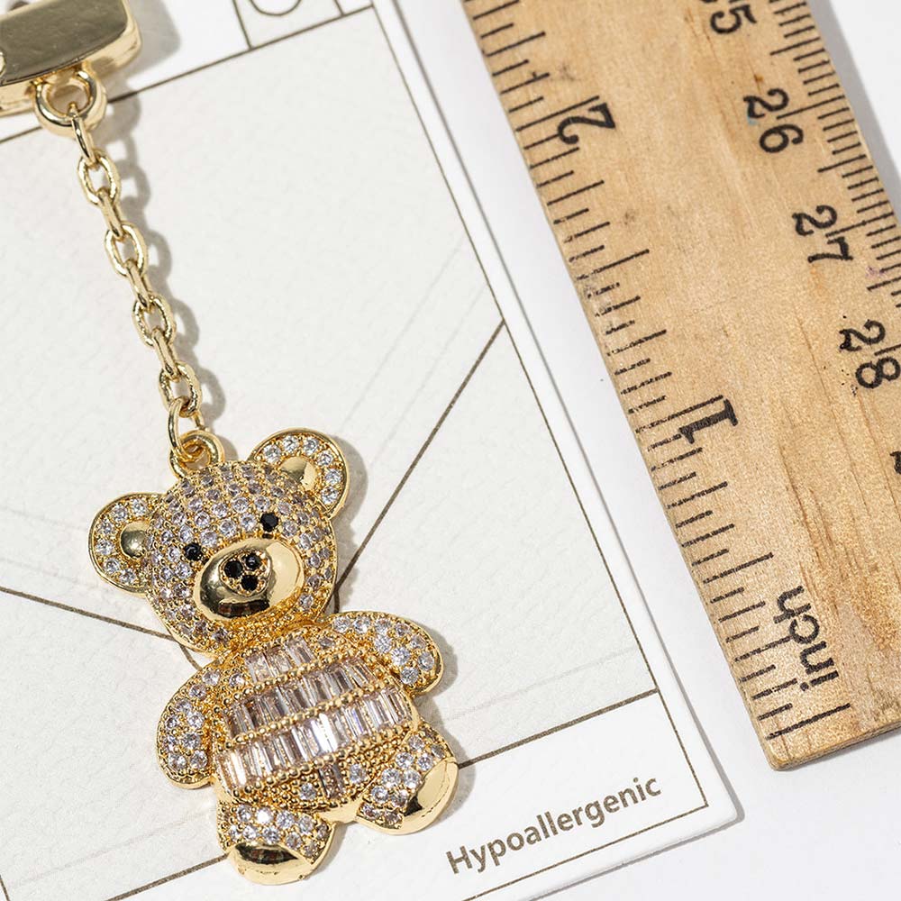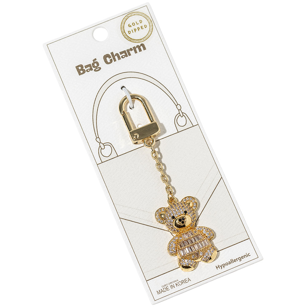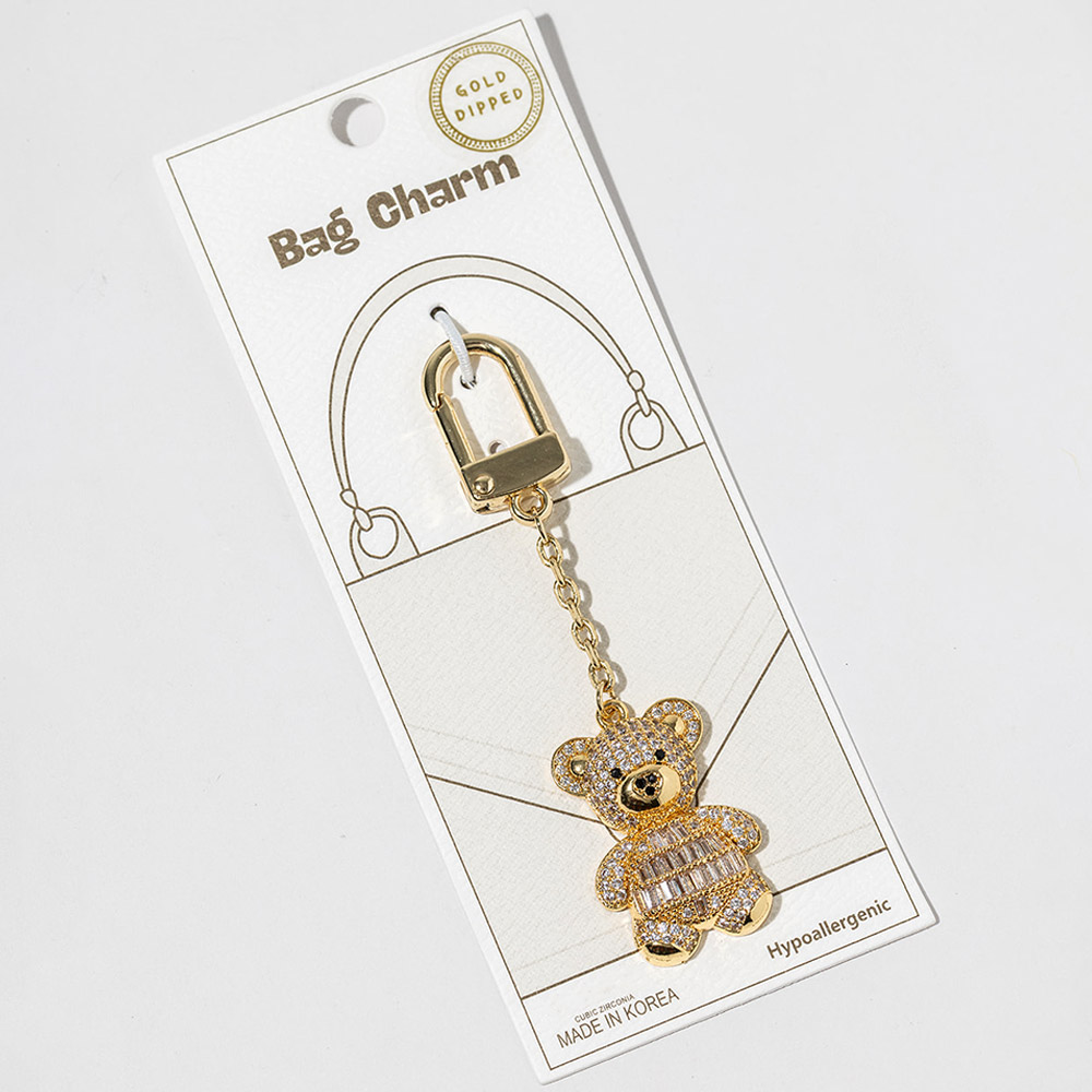 Details • Size : 3.4" L, 0.8" X 2" • Adorable teddy bear bag charm designed with sparkling crystal detailing for a playful yet eye-catching look. Easily clips onto handbags, totes, backpacks, or keys to add charm and personality. A fun accessory ideal for gifting, seasonal displays, and boutique collections seeking standout appeal. • Lead and Nickel Compliant • Hypoallergenic • Made In Korea • Gold Dipped • CZ Cubic Zirconia