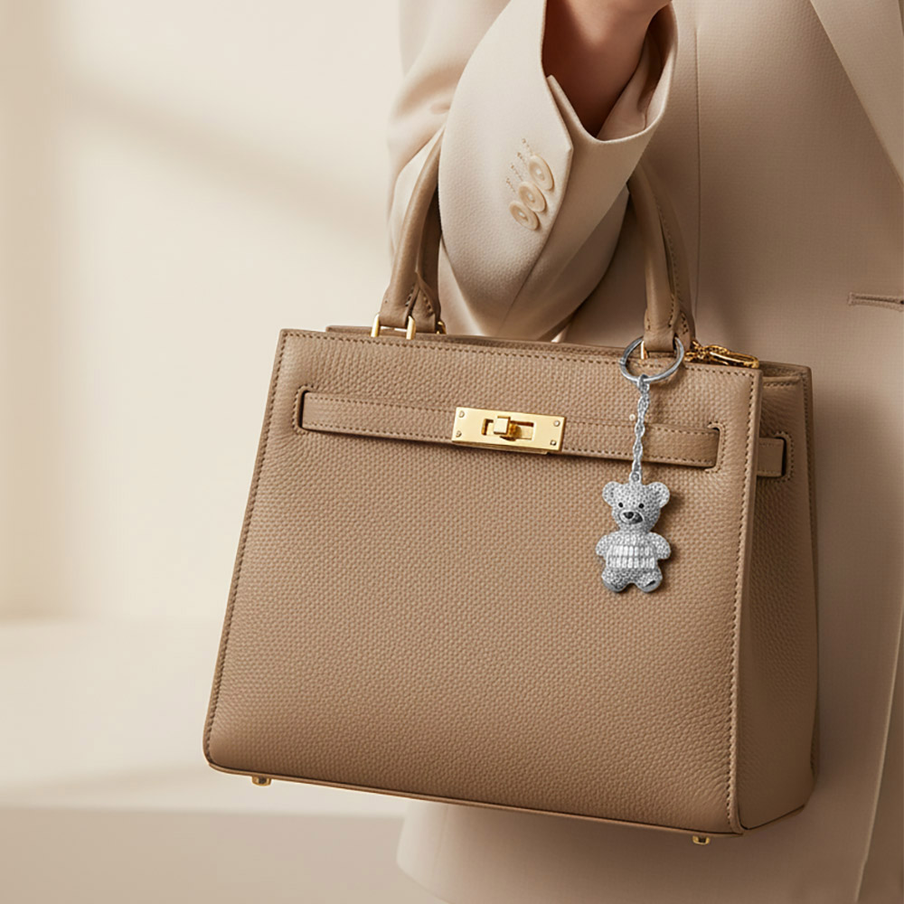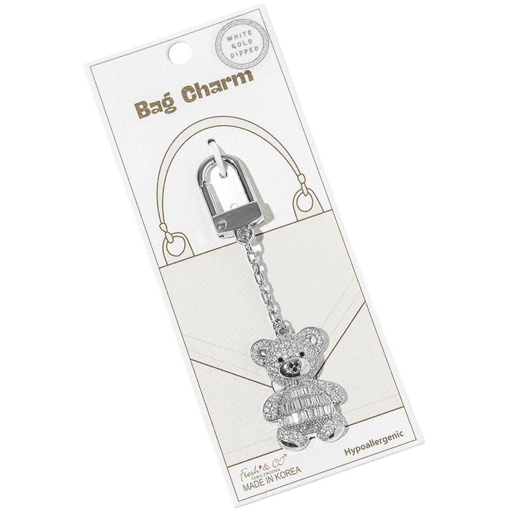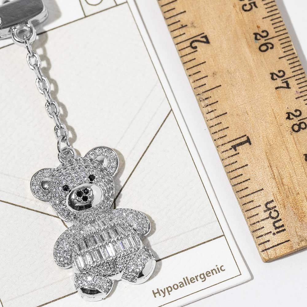 Details • Size : 3.4" L, 0.8" X 2" • Adorable teddy bear bag charm designed with sparkling crystal detailing for a playful yet eye-catching look. Easily clips onto handbags, totes, backpacks, or keys to add charm and personality. A fun accessory ideal for gifting, seasonal displays, and boutique collections seeking standout appeal. • CZ Cubic Zirconia • Gold Dipped • Hypoallergenic • Lead and Nickel Compliant • Made In Korea