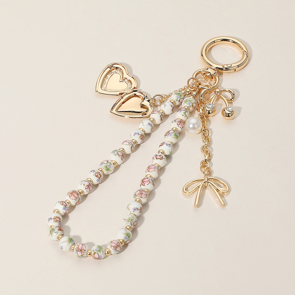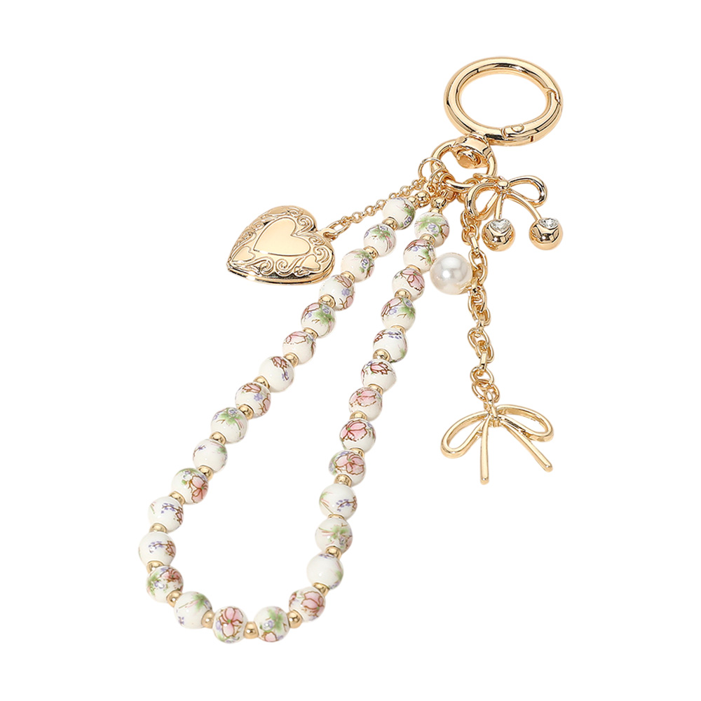 Metal Heart Locket Bow Cherry Pearl Charm Floral Pearl Beaded Wristlet Keychain / Bag Charm