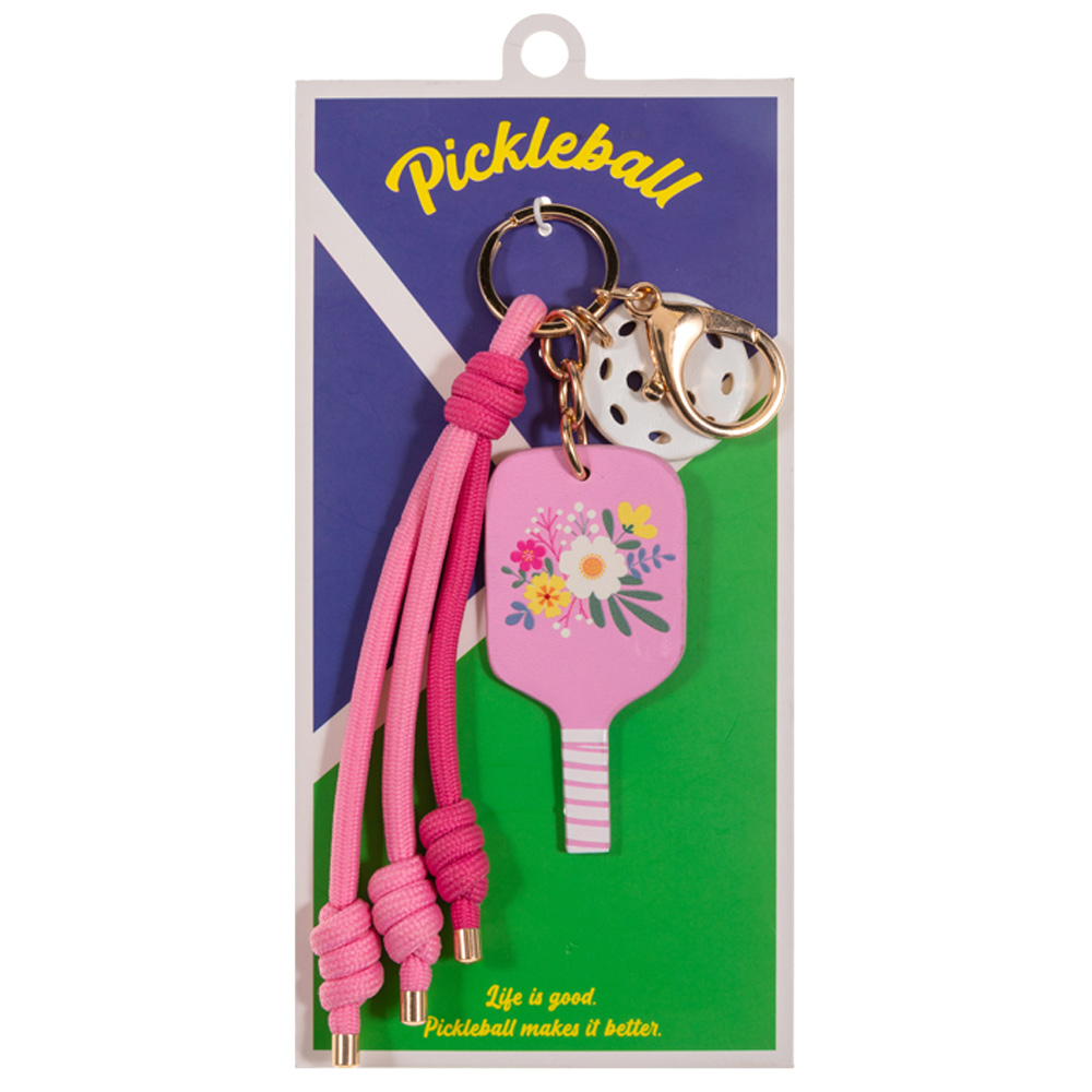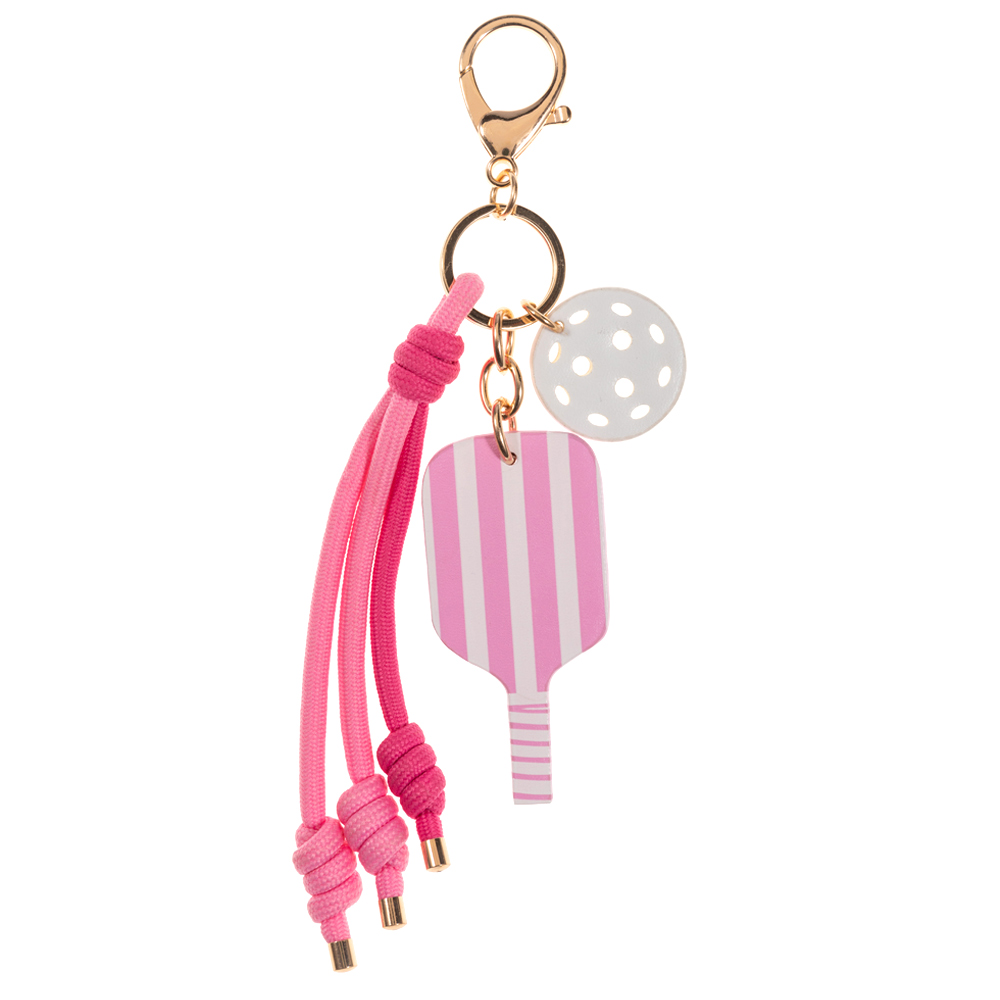 • This pickleball-themed keychain features a playful paddle charm paired with a perforated ball accent and knotted cord tassels for added texture and movement. Designed with a secure clasp for easy attachment, it’s a fun accessory for keys, bags, or backpacks and makes a great gift for pickleball fans, team events, and sporty lifestyle collections.