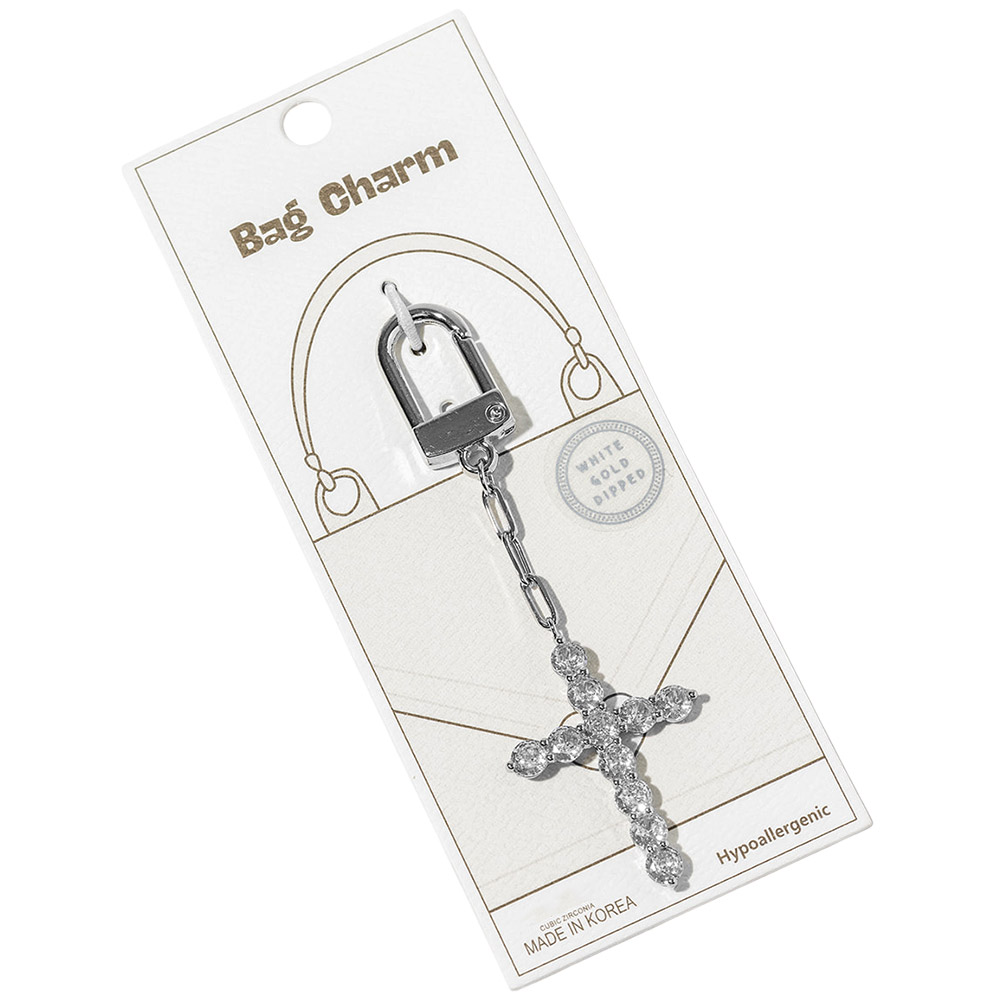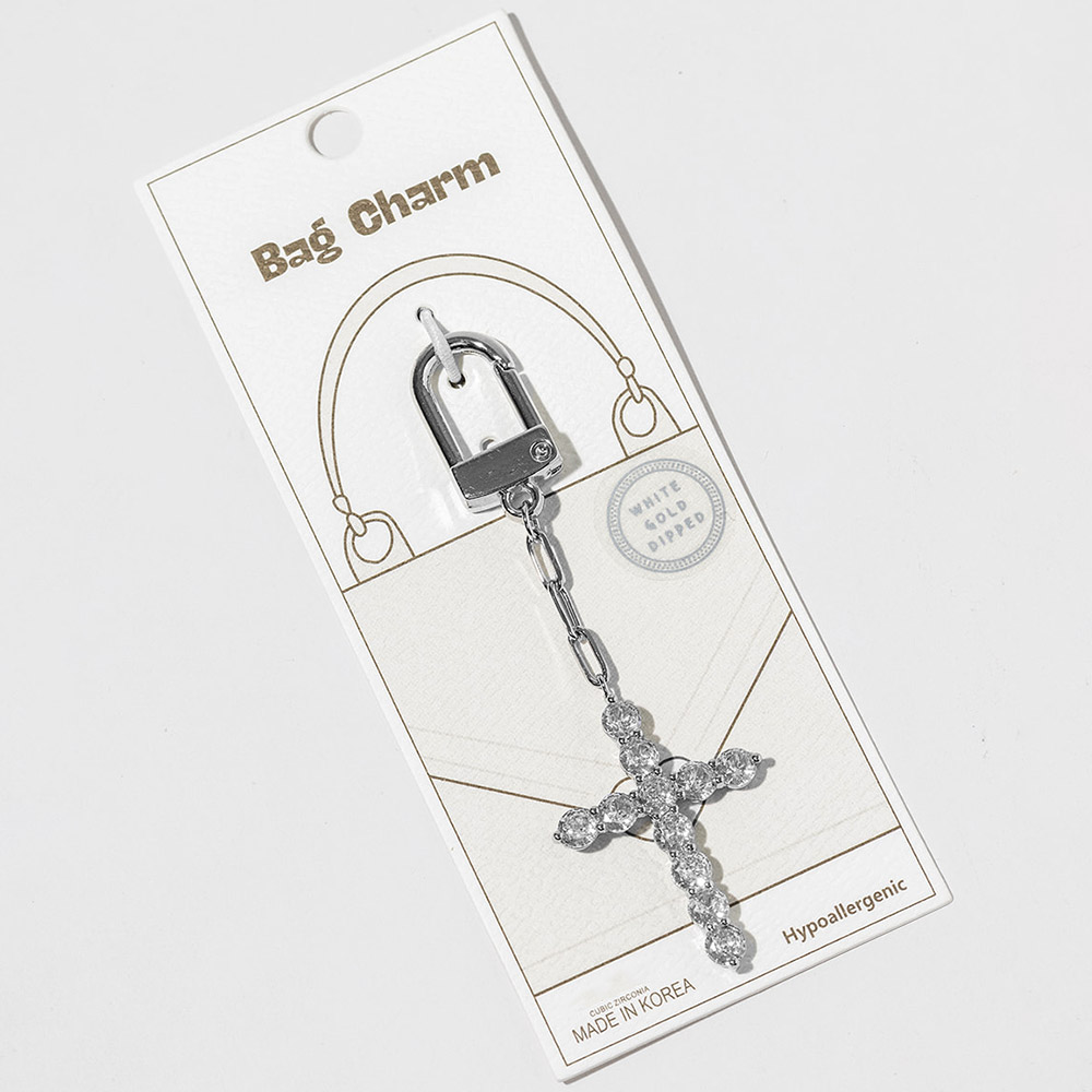 White Gold Dipped CZ Cross Drop Keychain Bag Charm