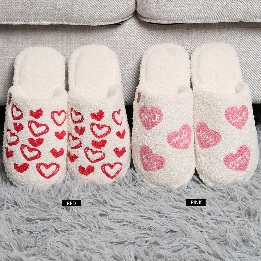 Details • Size : M/L (Women 8-10, Men 7-9) • Material : 100% Poly. Microfiber • Soft indoor slippers with adorable heart prints and fun messages. Designed in M/L size for cozy everyday wear around the house. Lightweight, comfortable, and easy to slip on for lounging.