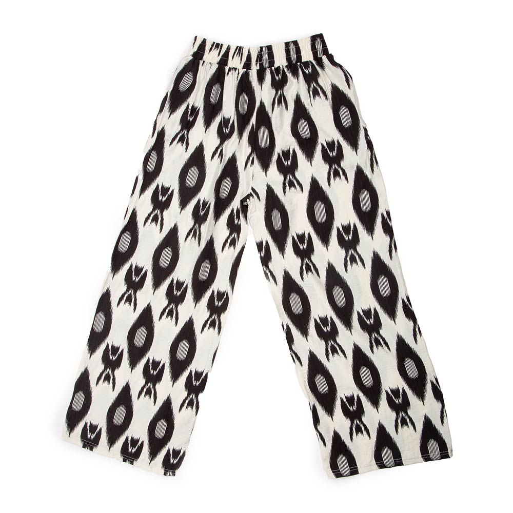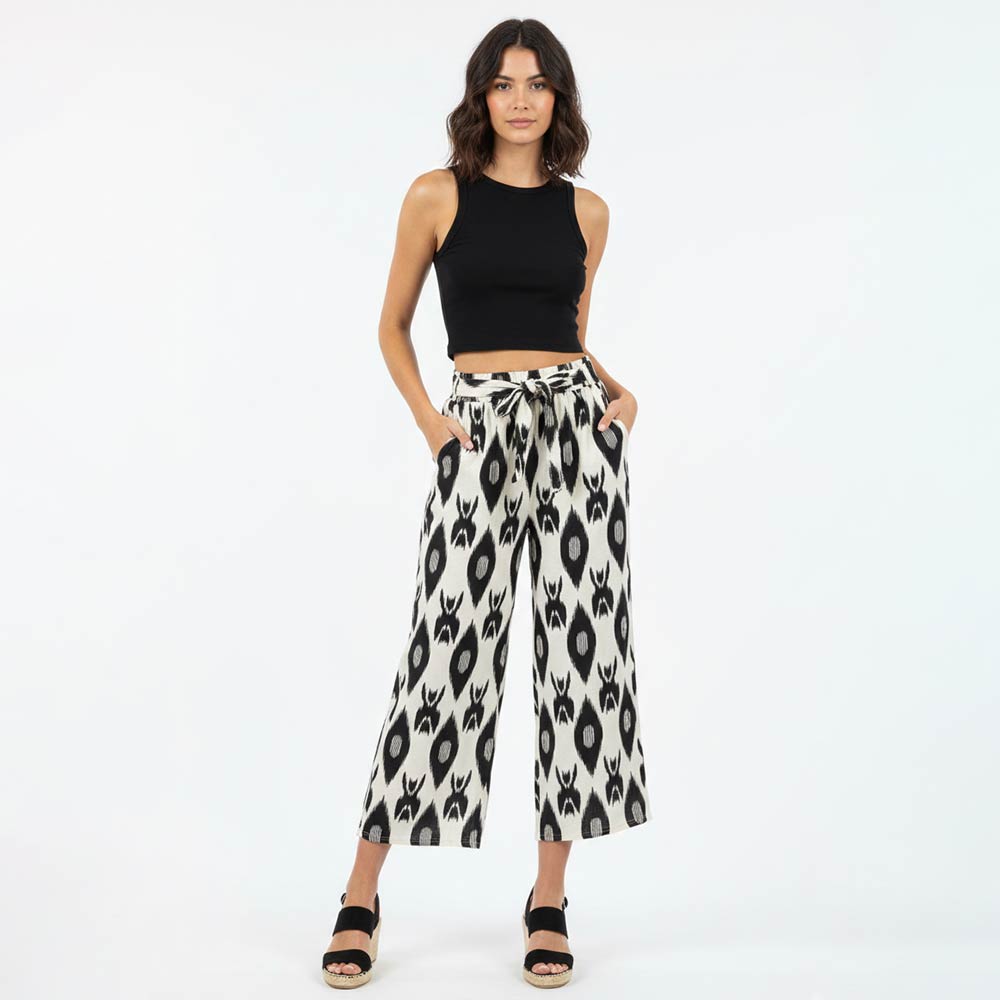• Statement ikat pattern wide leg pants featuring a relaxed fit and easy elastic waistband for everyday comfort. Designed for effortless styling, these pull-on pants offer fluid movement and a flattering silhouette. Ideal for casual wear, travel looks, or boutique collections, they pair seamlessly with simple tops and layered outfits for versatile, seasonless appeal.