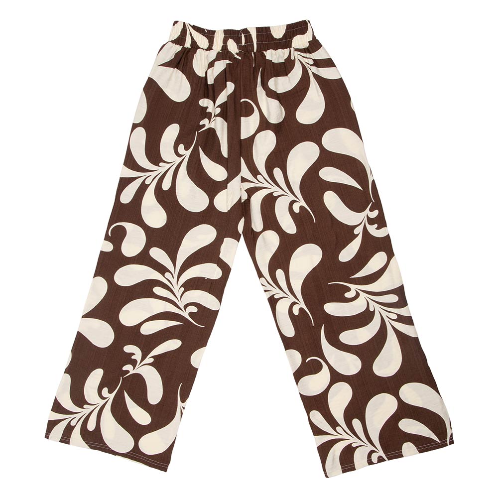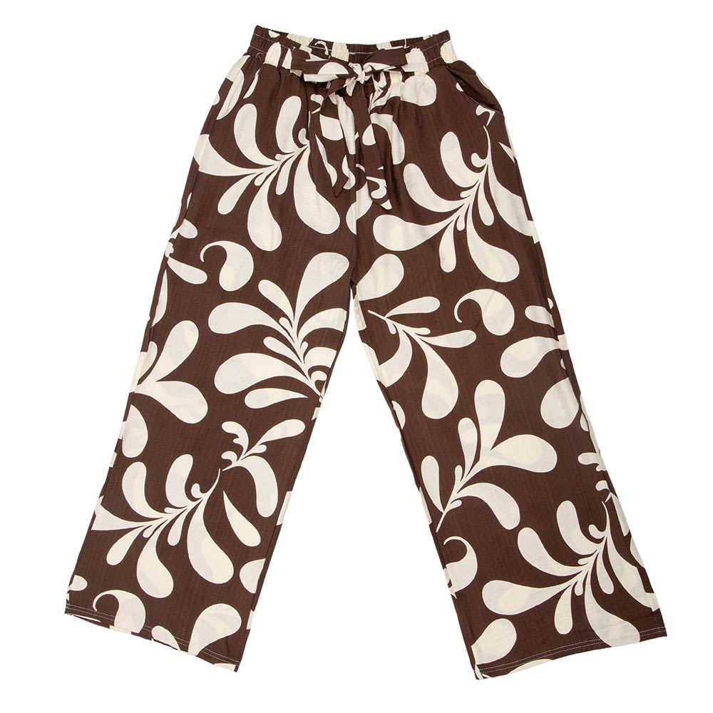 Details • Size : One Size • Material : 85% Viscose, 15% Polyester • Relaxed wide leg pants designed with an allover statement print and a comfortable elastic waistband with tie detail. Easy to style for casual outings, travel, lounging, or boutique collections. A versatile fashion piece that pairs effortlessly with tops, sandals, or layers for everyday wear and seasonal styling.