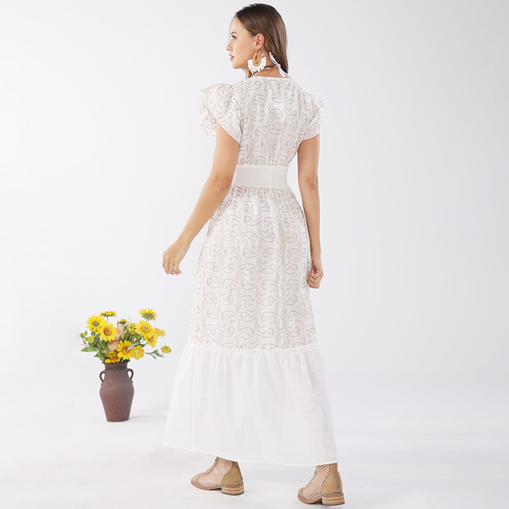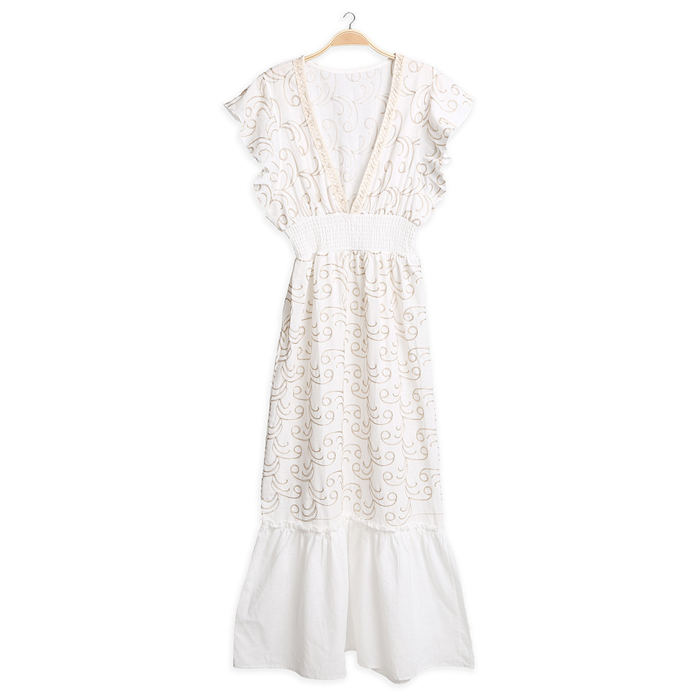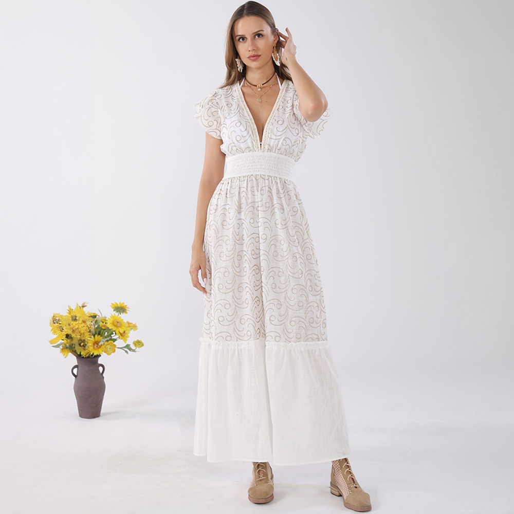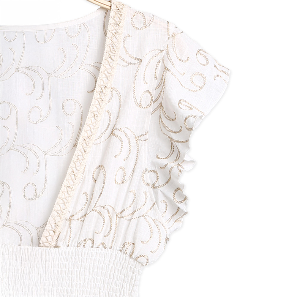 Details • Size : One Size • Material : 50% Cotton, 50% Viscose • Bohemian chic design with intricate embroidery • Breathable, lightweight fabric for all-day comfort • Smocked waistband for a flattering fit • Deep V-neck with ruffled sleeves for a stylish touch • Perfect for beach, vacation, or casual wear