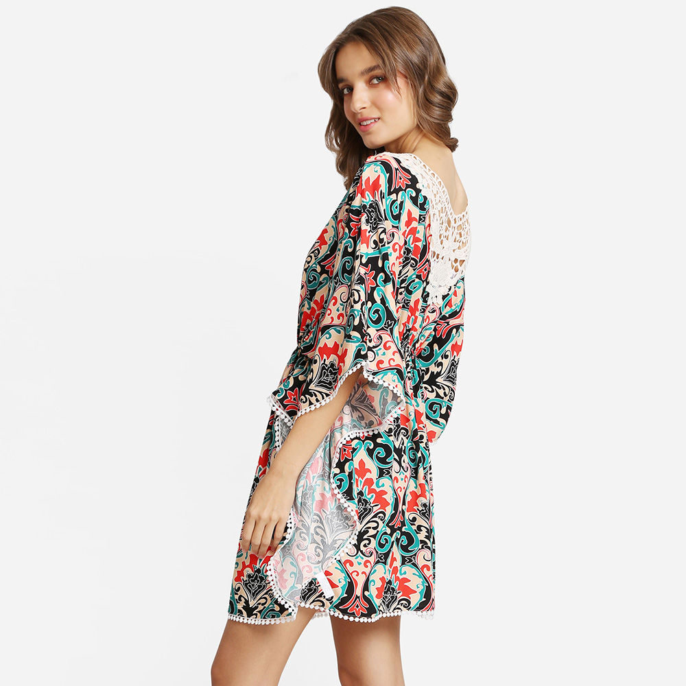 Details • Size : One Size • Material : 100% Viscose • Vibrant red and black patterned kaftan dress with cinched waist and white pom-pom trim. Crafted from soft viscose, this bold boho piece is perfect for beachwear, vacations, or summer styling.