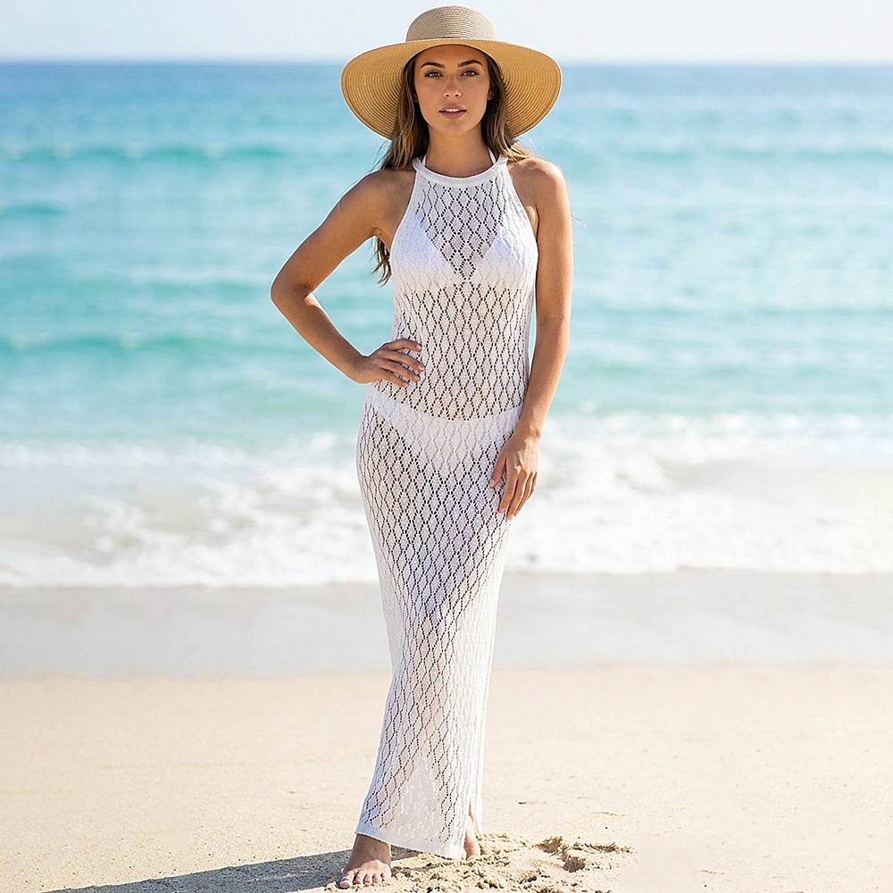 • This halter neck crochet maxi beach cover up dress features an airy open-knit design with a flattering silhouette and side slit for effortless movement. Ideal for layering over swimwear, it’s perfect for beach days, poolside lounging, resort getaways, cruises, and summer boutique collections seeking relaxed yet elevated style.