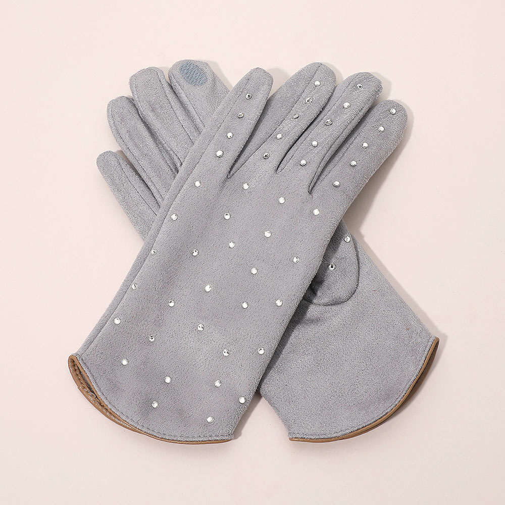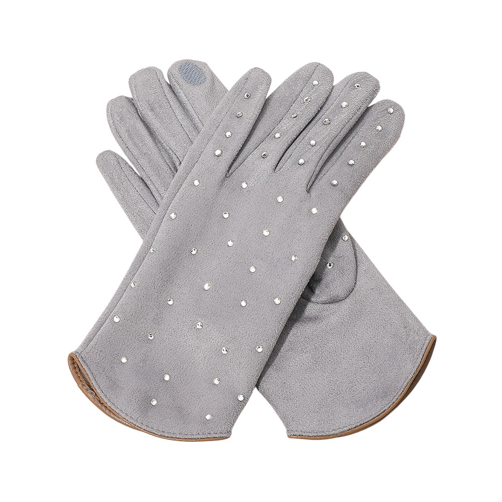 Details • Size : One Size (9" L) • Material : 100% Polyester • Smart Touch • Elegant smart touch gloves adorned with sparkling rhinestones and a sleek trim finish. These stylish gloves combine comfort with functionality, allowing touchscreen use while keeping hands warm and chic — perfect for both casual outings and sophisticated cold-weather looks.