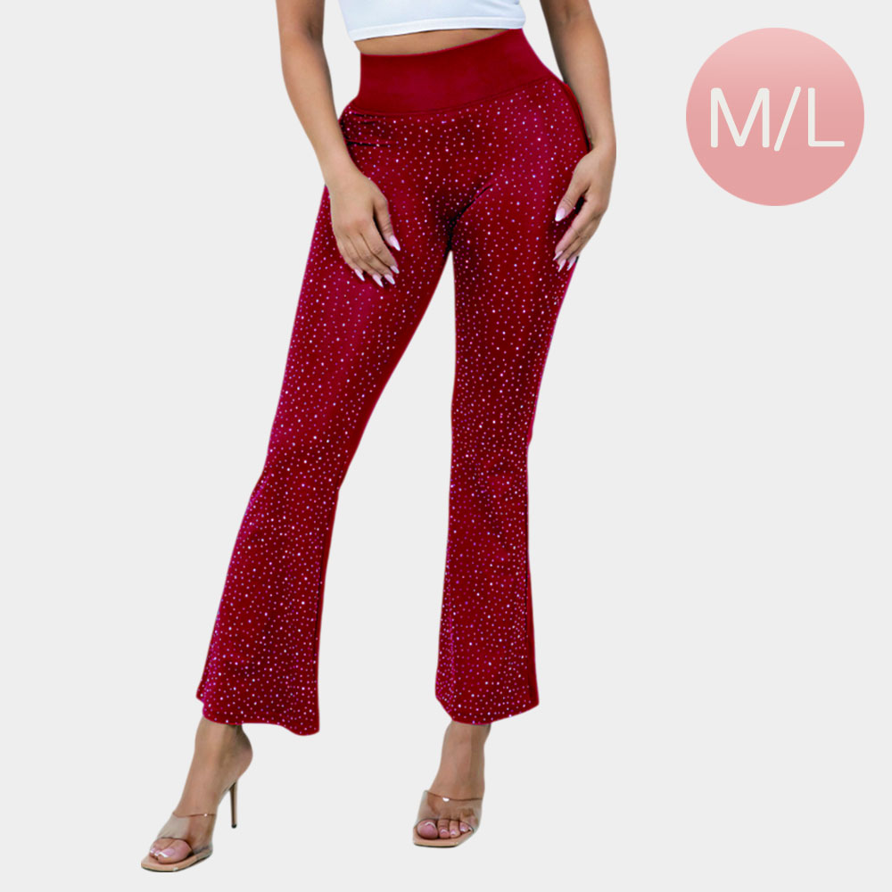 Details • Size : M-L • Material : 92% Polyester, 8% Spandex • Big Stone FRONT Only • Hand Wash in Warm Water • Do not bleach / hang dry • Stylish red flare leggings with sparkly detail and a comfy high-rise waistband. Designed for M/L curves with flattering stretch and shine.