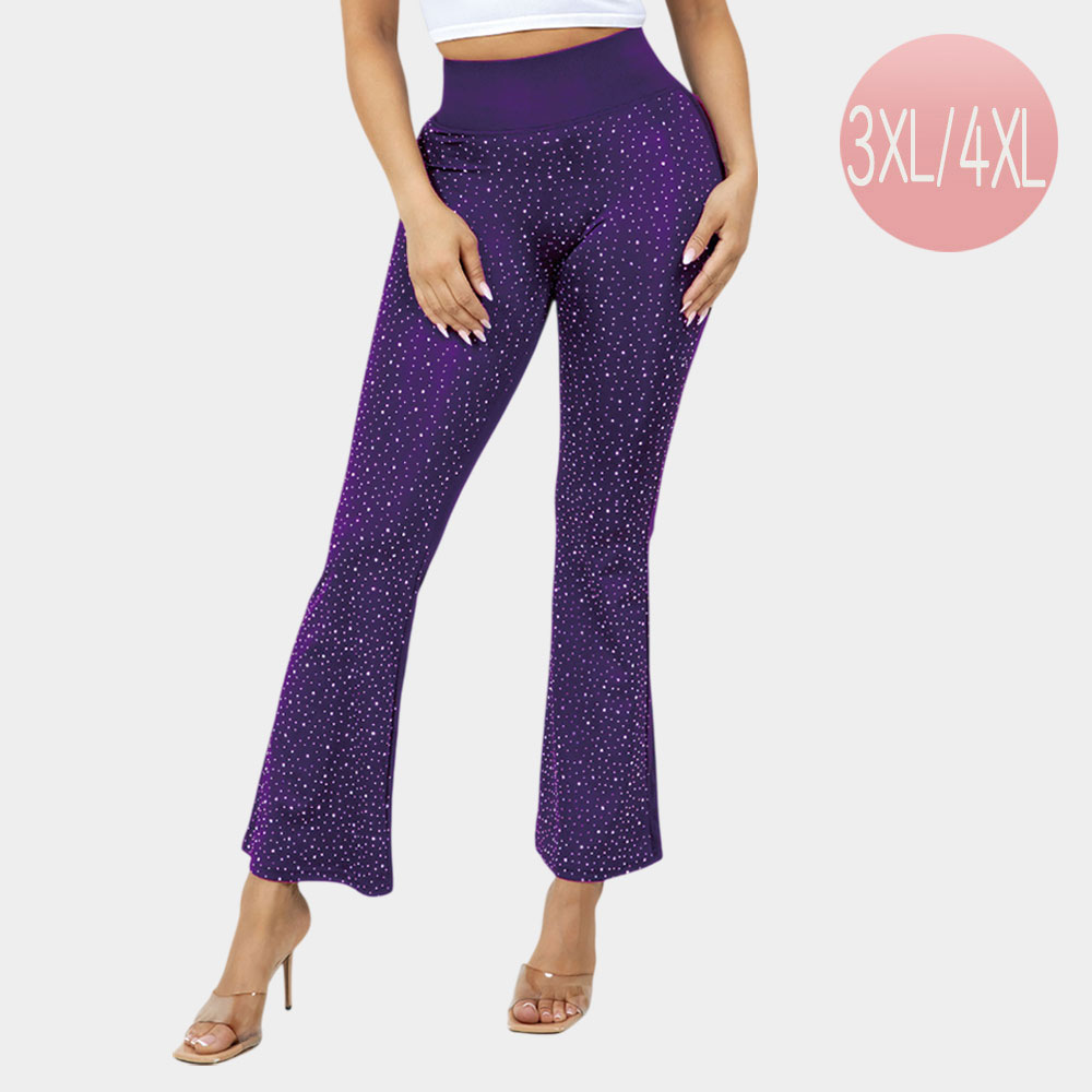 Details • Size : 3XL-4XL • Material : 92% Polyester, 8% Spandex • Big Stone FRONT Only • Hand Wash in Warm Water • Do not bleach / hang dry • Stylish purple flare leggings with sparkly detail and a comfy high-rise waistband. Designed for 3XL/4XL curves with flattering stretch and shine.