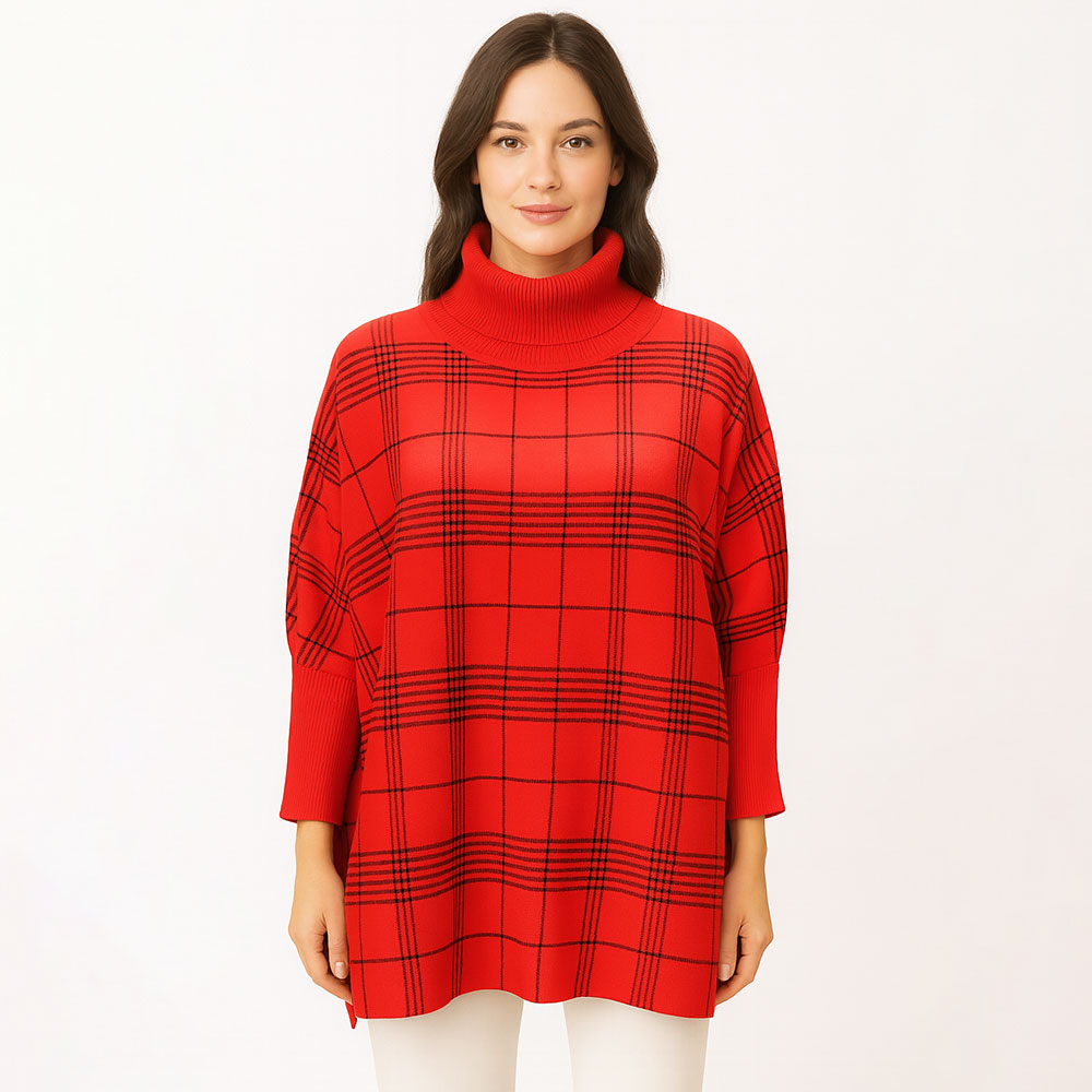 • Turtleneck poncho sweater with a clean checked pattern, relaxed draped fit, and long ribbed sleeves. A stylish and comfortable layering piece designed for everyday wear, offering a modern look with a soft, easy silhouette.