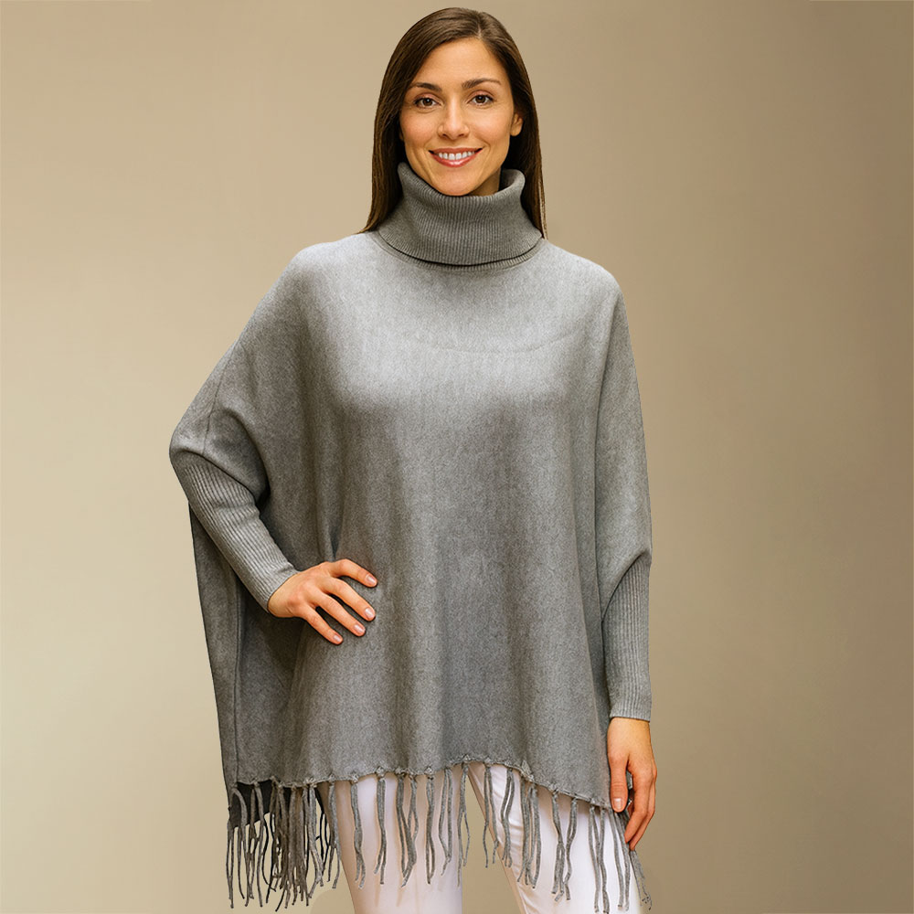 • Stylish turtleneck poncho featuring a relaxed silhouette and flowing fringe hem, designed for easy layering and everyday comfort. Its soft drape and refined details create a chic look perfect for casual outings or polished ensembles.