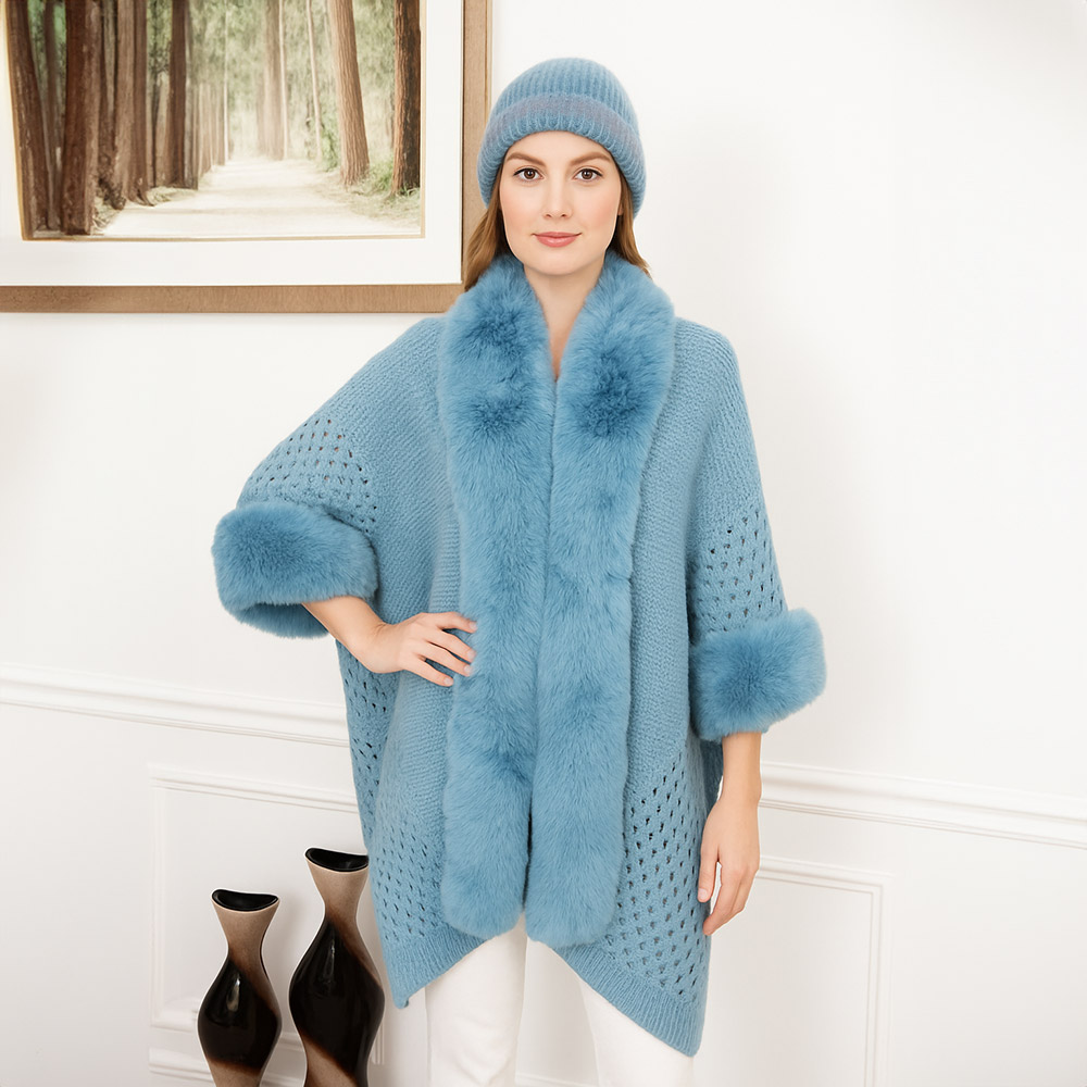 • This stylish open-knit cape is accented with soft fur trim along the collar and cuffs, blending cozy texture with refined detail. A versatile layering piece, it drapes gracefully for day-to-night wear, offering warmth, sophistication, and timeless appeal.