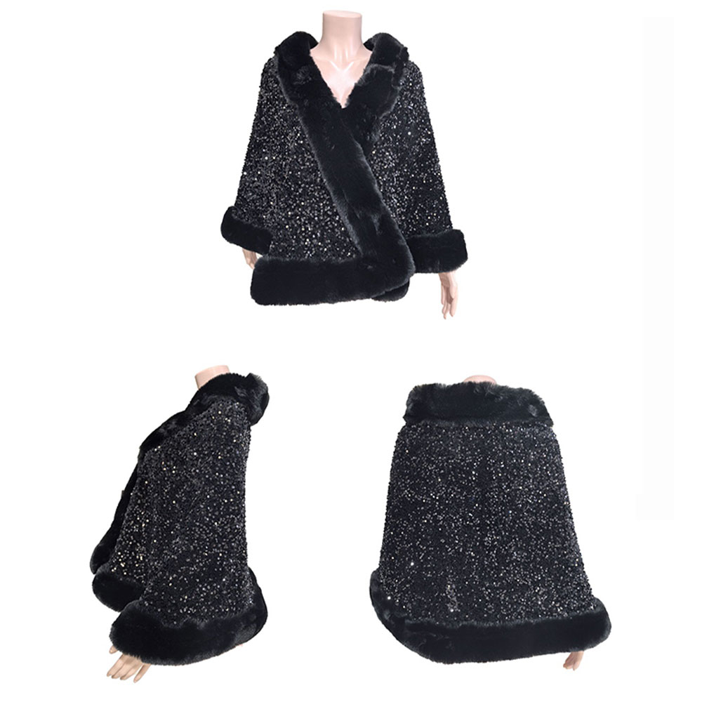 Details • Size : One Size • Material : 100% Polyester • Chic shawl-style coat featuring a shimmering sequin body and plush trim for an elegant, high-impact look. Perfect for winter events, evening outings, photoshoots or adding glamorous warmth to special occasion outfits with its sophisticated, luxurious silhouette.