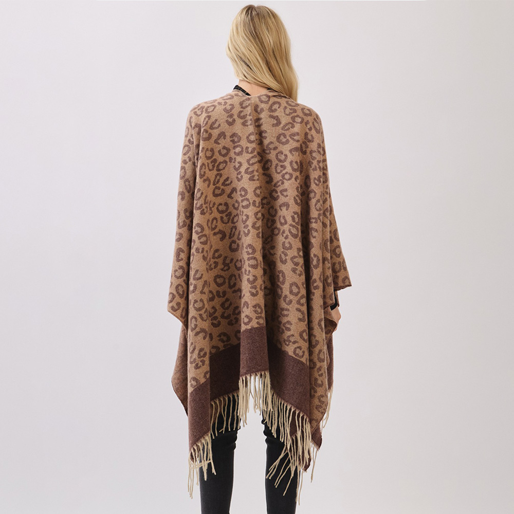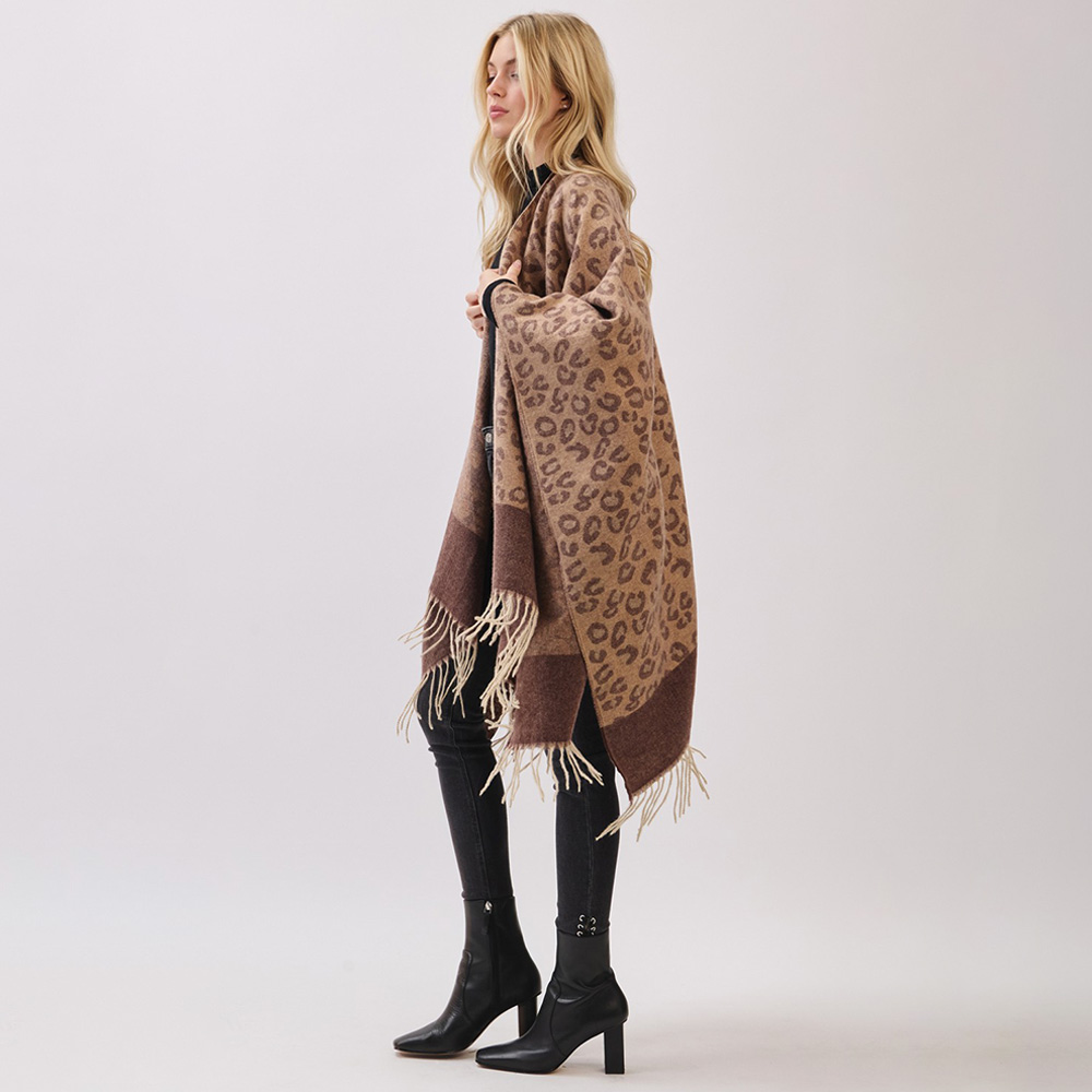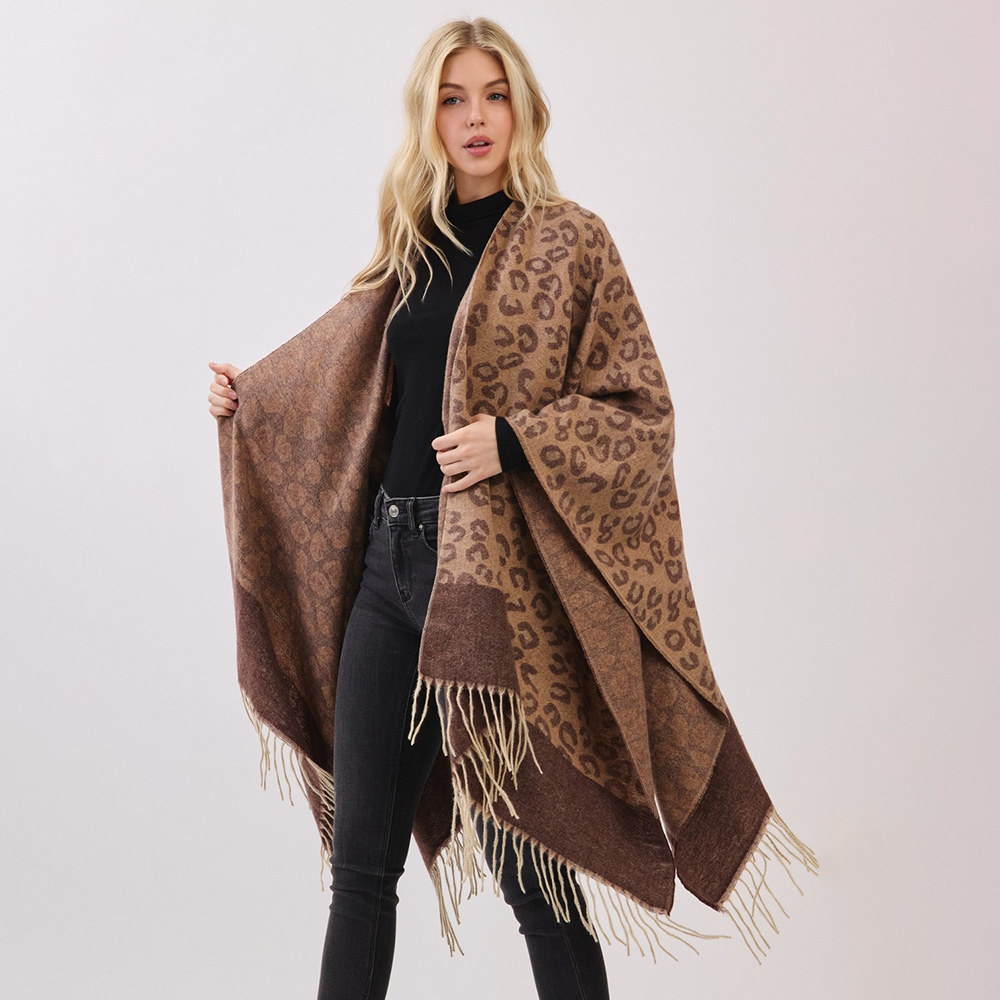 Details • Size : 56" X 33.5" • Material : 100% Polyester • A soft poncho wrap featuring a bold leopard pattern with a contrasting border and fringe hem. Designed for easy layering, this cozy piece brings warmth, comfort, and a chic statement look to seasonal outfits.