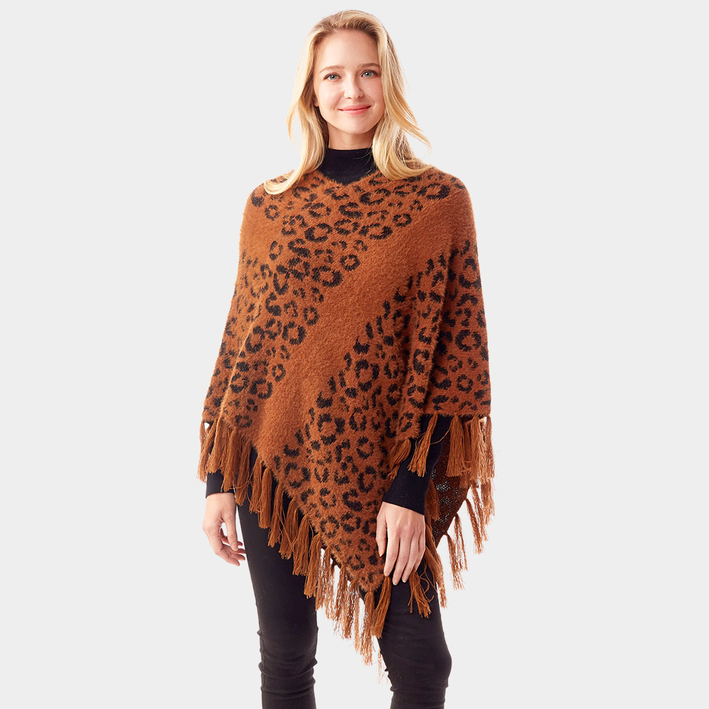 • Wrap yourself in comfort and style with this animal print poncho featuring bold contrast patterns and fringe trim. Perfect for layering on cooler days, it adds warmth and fashionable flair to casual or dressy looks.