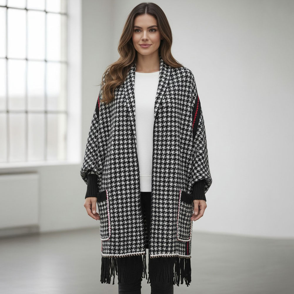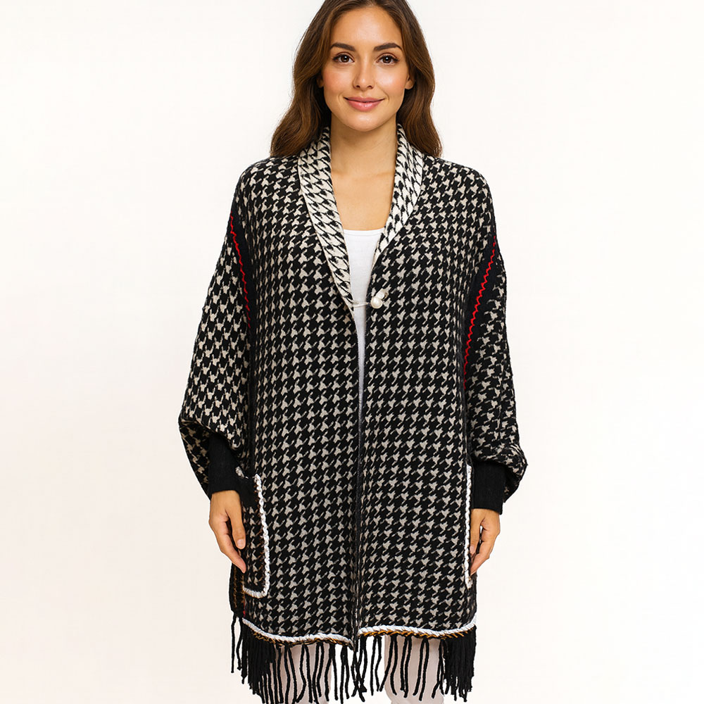 Details • Size : 44" X 54" • A chic open-front cardigan wrap featuring an oversized houndstooth pattern, contrast trim, roomy sleeves, and fringe hem. Designed for comfort and style, it layers effortlessly over casual or dressy outfits, making it perfect for everyday wear, travel, or gifting.