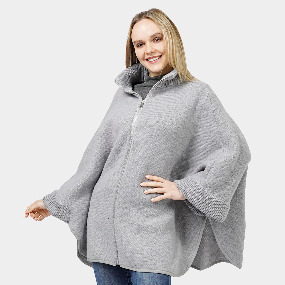 Details • Size : One Size (27.5" L) • Material : 100% Polyester • Modern cape coat featuring a zip-up front, funnel neckline, and wide sleeves with cuff detail. Offers a cozy, relaxed fit that's perfect for layering in cool weather. A chic blend of comfort and minimalist style for everyday wear.