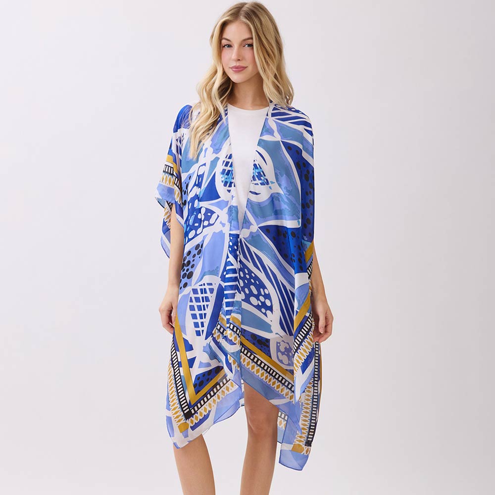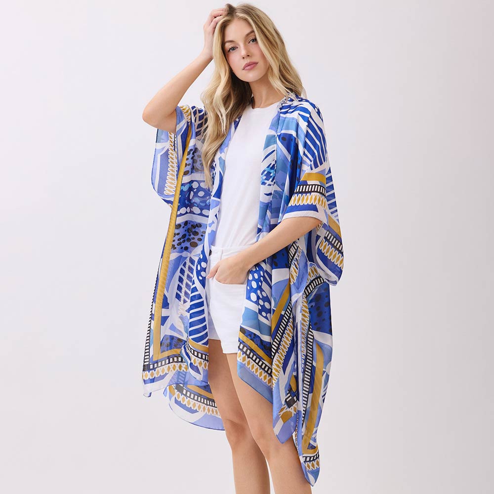 • This open front kimono poncho showcases a modern geometric pattern with a flowy, relaxed fit designed for effortless layering. Perfect for casual outfits, resort styling, or travel looks, it adds bold visual appeal while remaining lightweight and versatile for boutique assortments and gift-focused fashion collections.