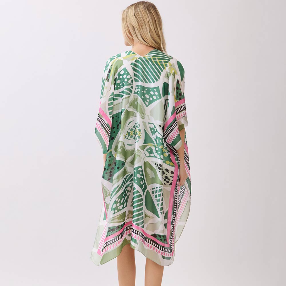 Abstract Botanical Print Silky Feel Kimono Poncho