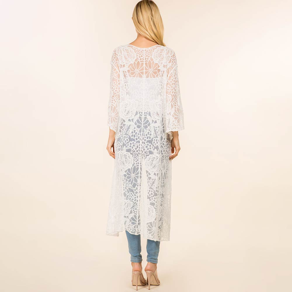 Floral Lace Open Tie Front Long Kimono Poncho