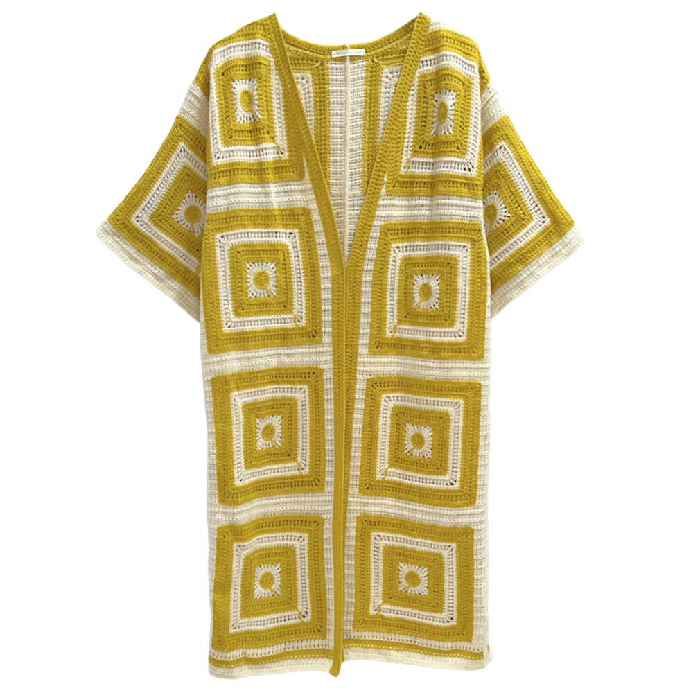 Details • Size : 21" X 40.6" • Material : 100% Acrylic • This granny square crochet long cardigan features an open-front silhouette with bold geometric panels for a statement look. Designed for effortless layering, it adds texture and movement to everyday outfits. Perfect for boutique fashion collections, seasonal transitions, casual styling, and boho-inspired wardrobes.