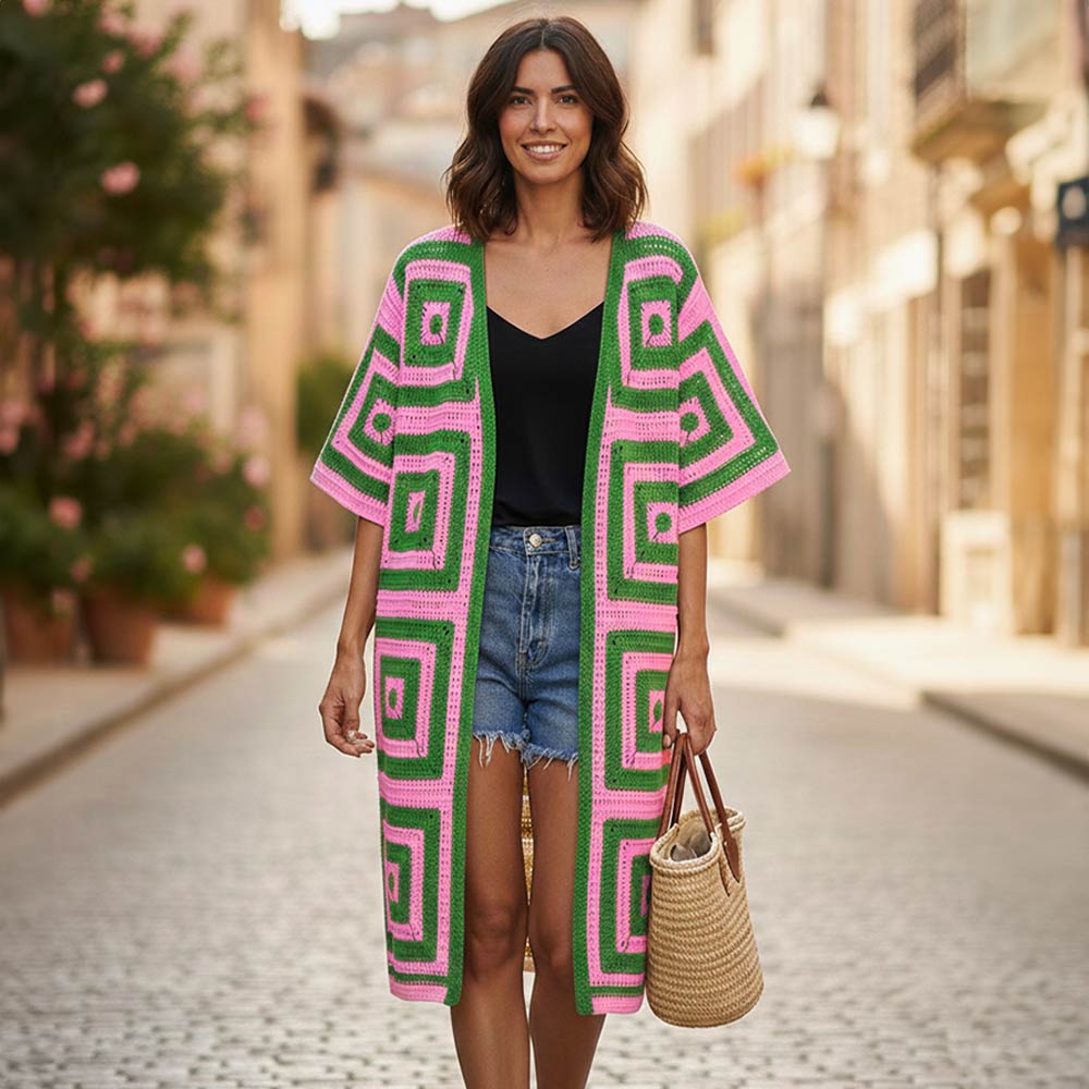 • This granny square crochet long cardigan features an open-front silhouette with bold geometric panels for a statement look. Designed for effortless layering, it adds texture and movement to everyday outfits. Perfect for boutique fashion collections, seasonal transitions, casual styling, and boho-inspired wardrobes.