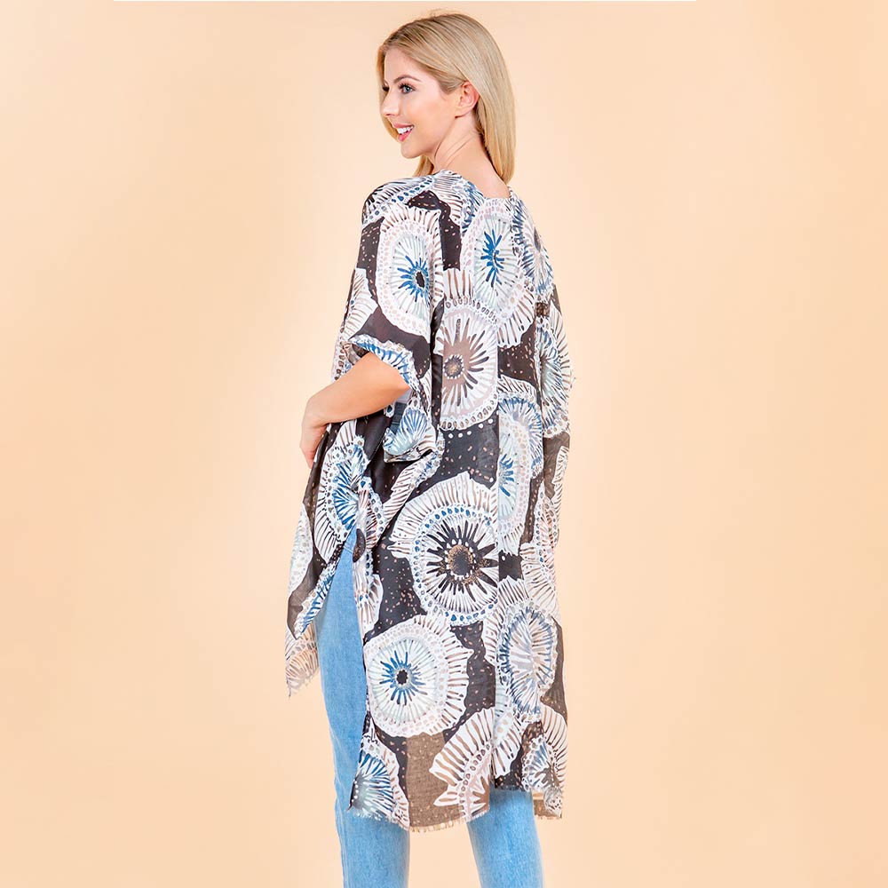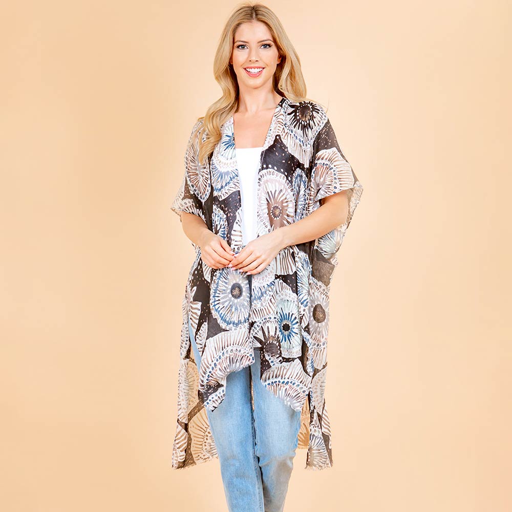 • Relaxed open front kimono wrap designed with an eye catching printed pattern and flowy silhouette. Easy to layer over tanks, tees, or dresses, it adds light coverage, movement, and a polished touch to everyday outfits, travel looks, or casual occasions.