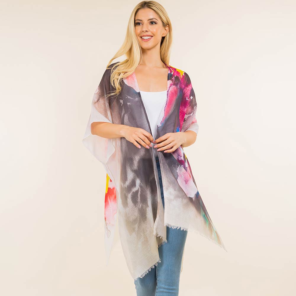 • Flowy open front kimono wrap designed for effortless layering and everyday versatility. Features a soft drape and relaxed silhouette that elevates casual outfits or complements dresses. Ideal for travel, work, or weekend wear, adding movement and a polished finishing touch.