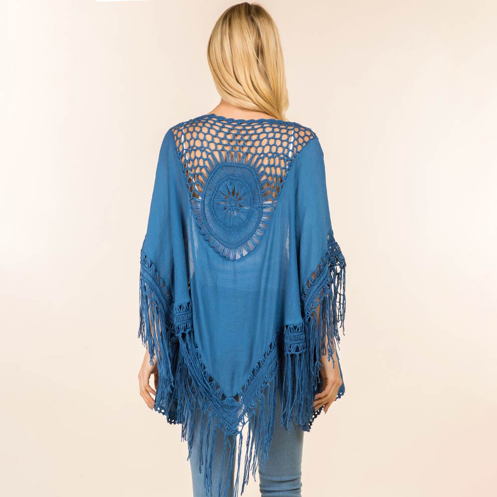 Open Front Fringe Embroidered Kimono Poncho Cardigan